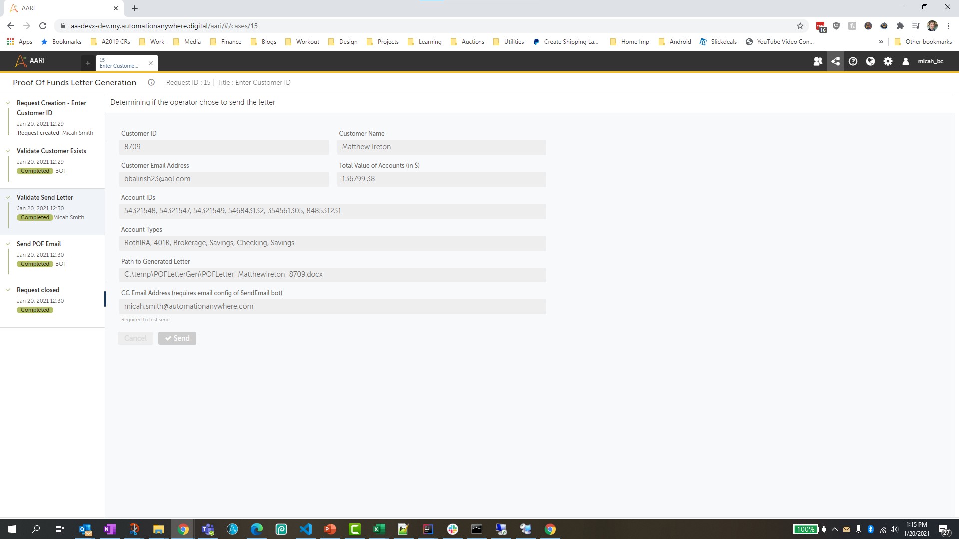Once this customer research is complete, AARI will display the researched data and letter location to a user in AARI Web for confirmation before sending the customer an email. If approved, the final bot will send the customer an email using standardized language and an attachment - the requested proof of funds letter.