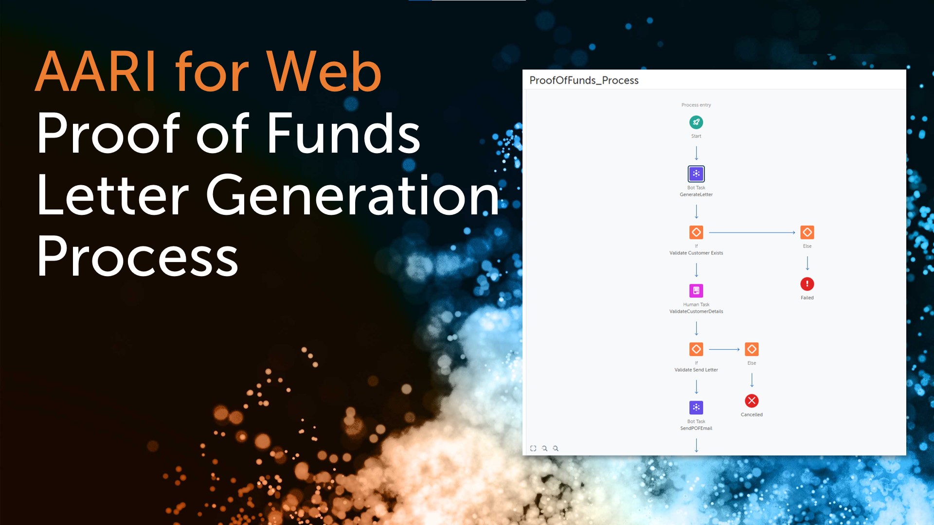 The AARI for Web - Proof of Funds Letter Generation Process is a demo AARI web experience that simulates the process of a customer service agent invoking bots to research and produce a proof of funds letter. Proof of funds letters are commonly used in support of home/auto loans and are generated by financial services institutions.
