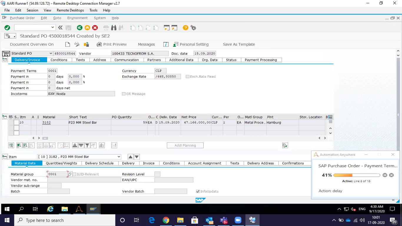 Using AARI (Automation Anywhere Robotics Interface), this bot will log in to the SAP application and navigate to the Purchase Order page. It will change the Payment Terms for PO based on User request.