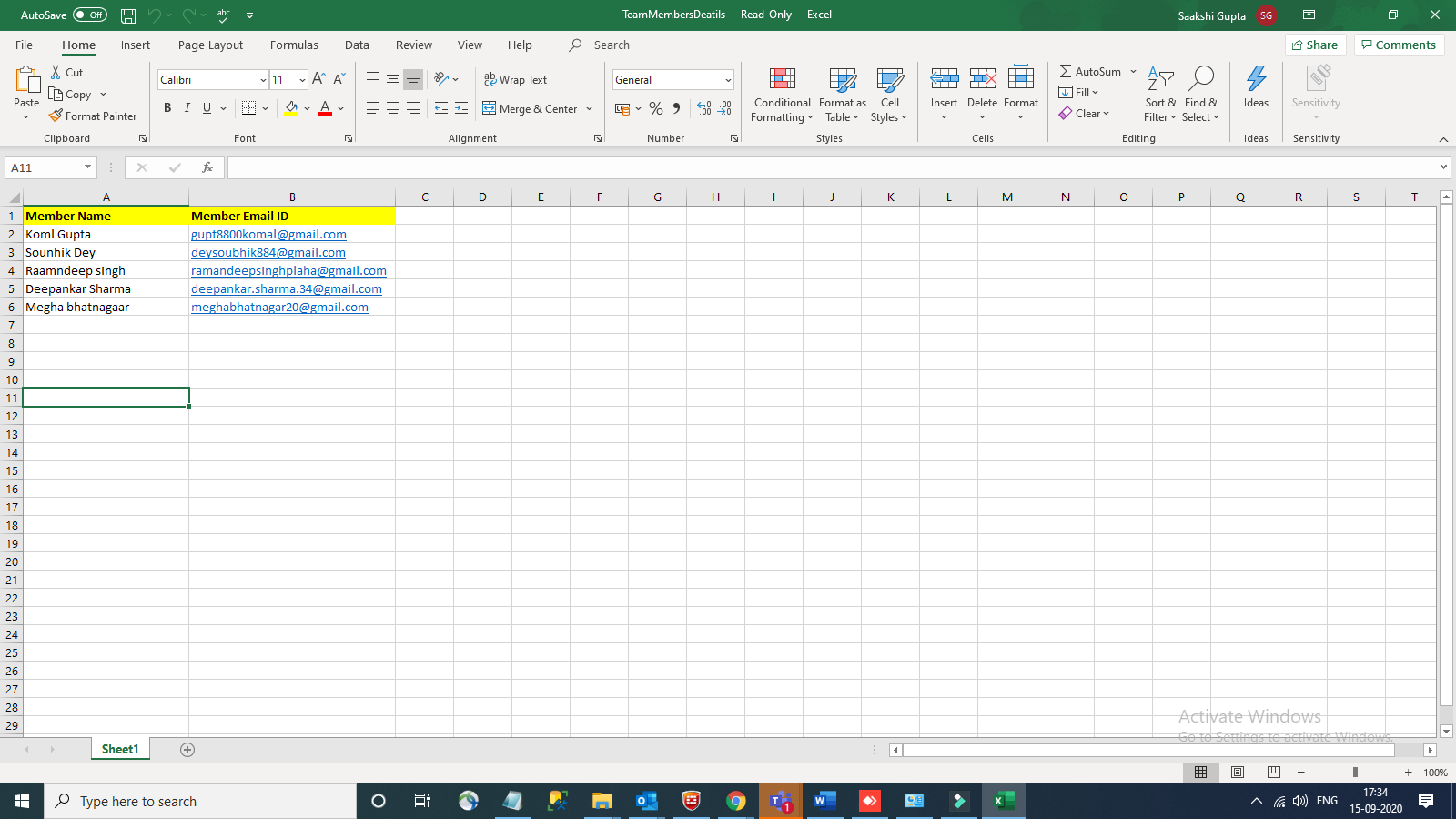 This bot will open the input Excel file (TeamMembersDeatils.xlsx), which consists of Team members' names with their email IDs.