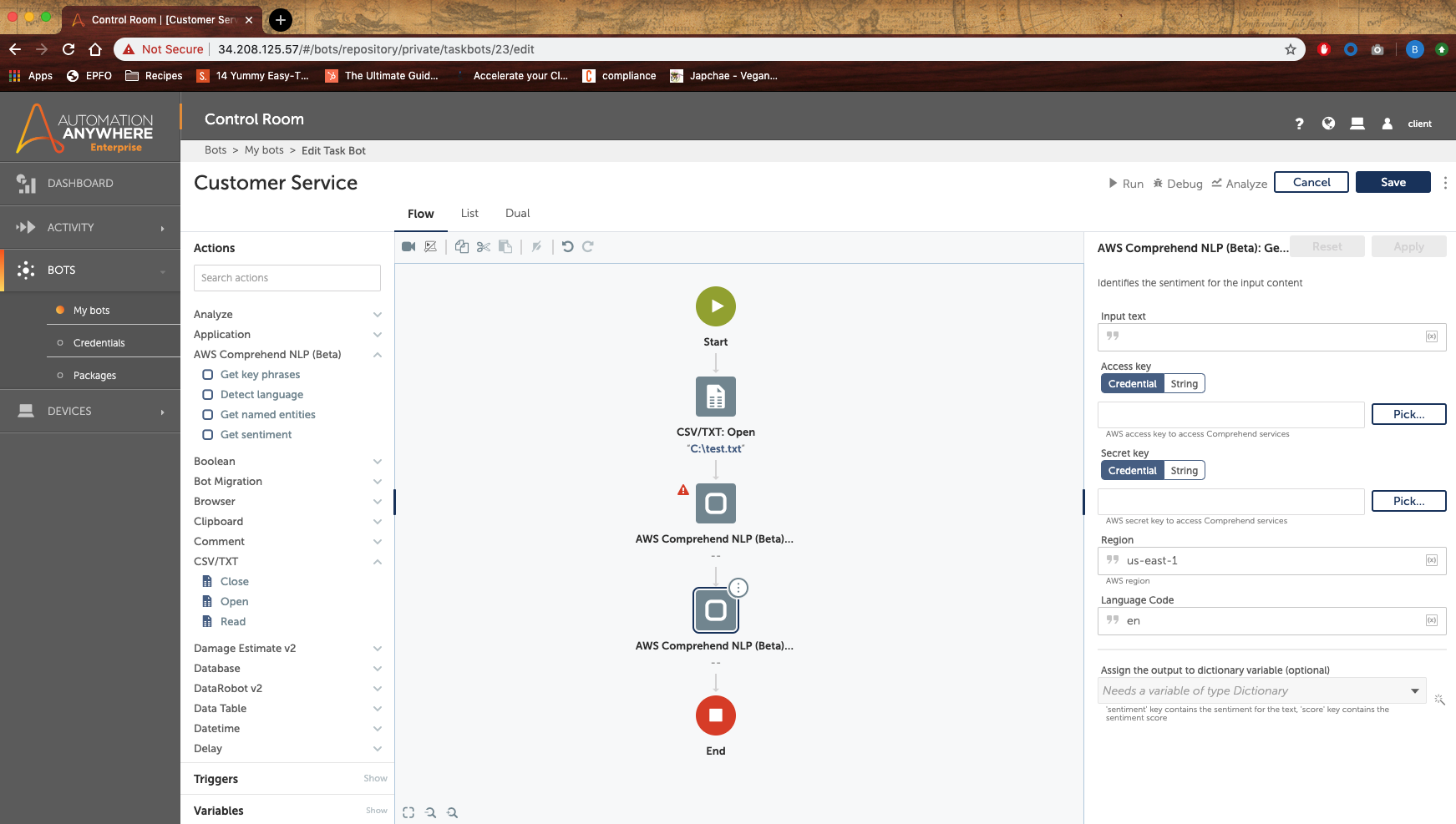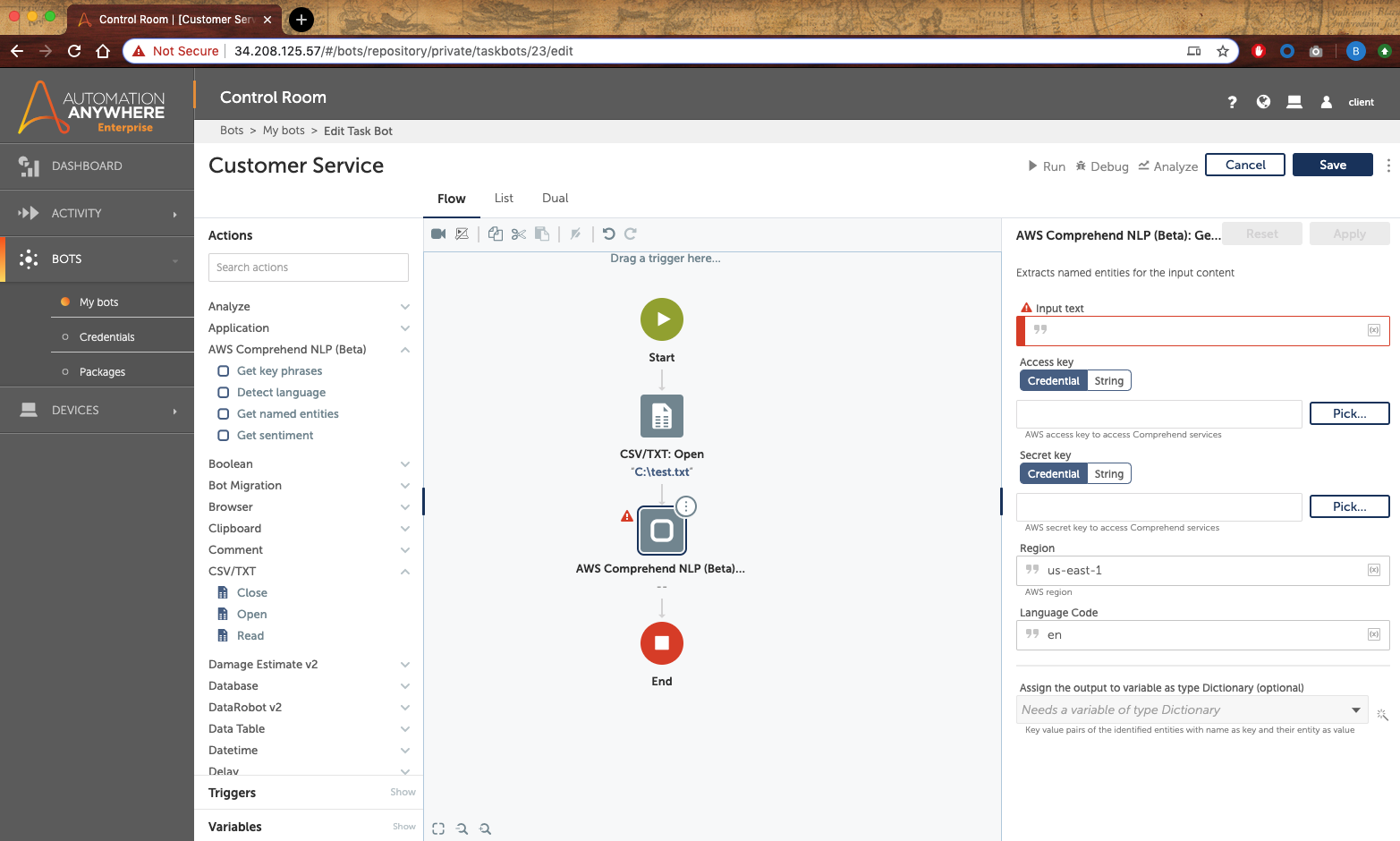 You can train the AWS comprehend models to extract key information from social media posts, emails, web pages, documents, phone transcripts and medical records. This text is sent to AWS comprehend to perform any one of the actions you have chosen for your bot workflow. It automatically extracts data, topics and classifies documents with confidence scores.