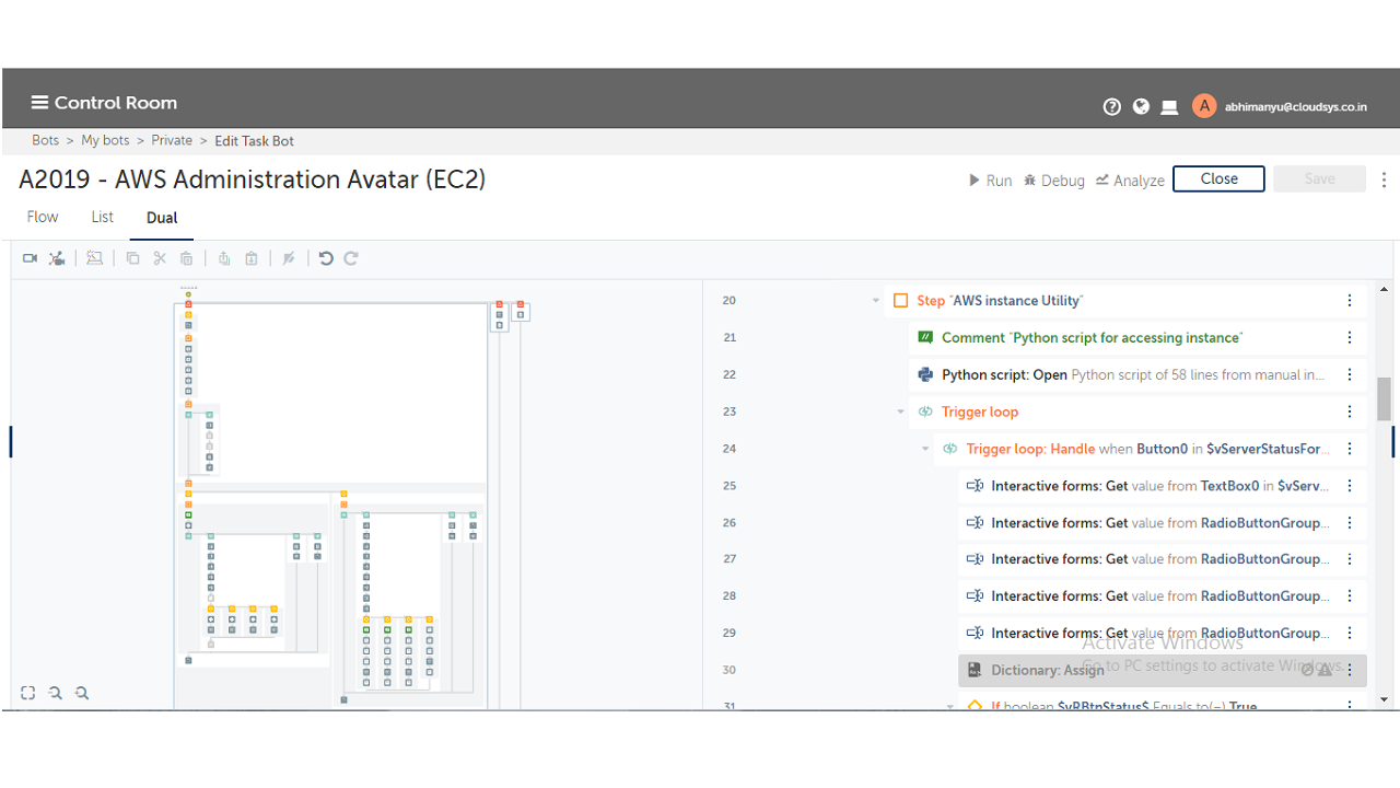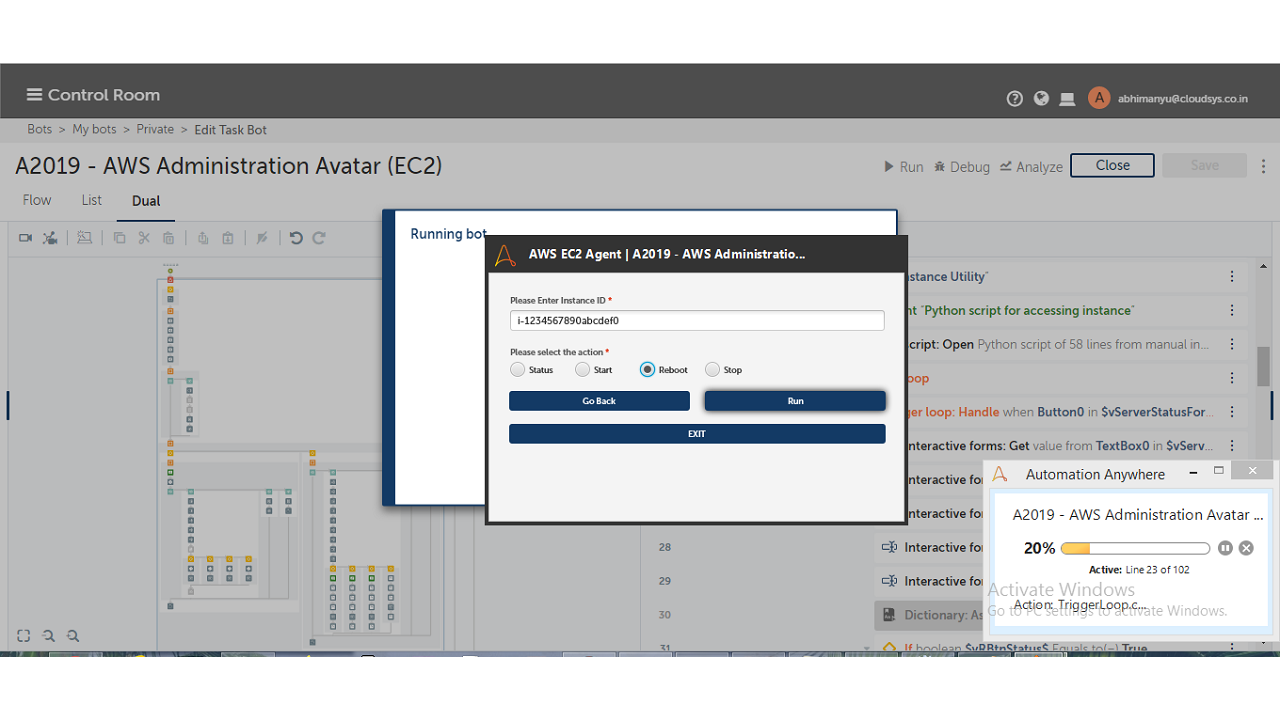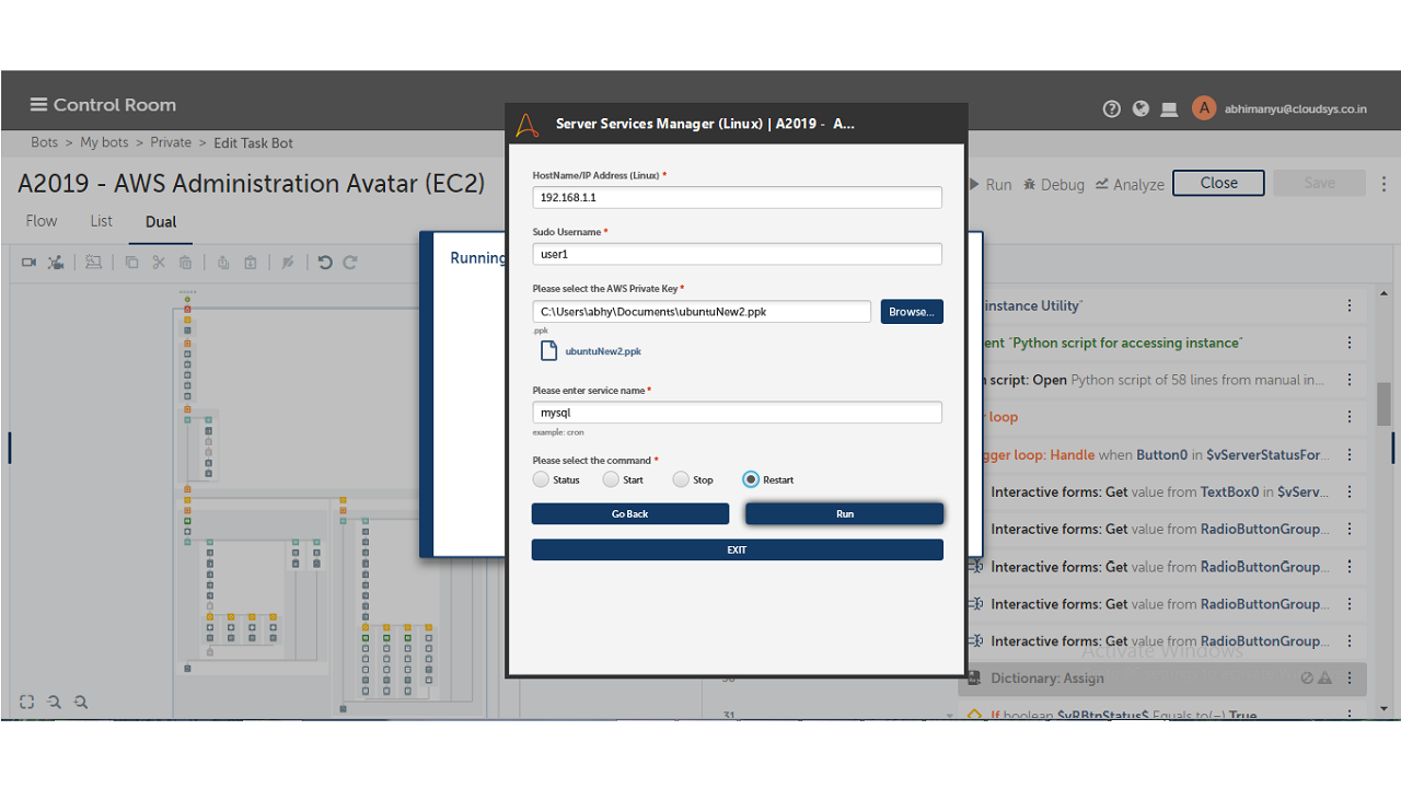 This bot helps to reduce the effort of the AWS EC2 instance administration while logging in. In an emergency, the user can start, stop, restart, check the status without logging in. The user can choose two different features includes AWS Administration and Linux server service utility. The user can check the status of a Linux machine that is in the AWS EC2 pool. If required, the user can change its status (start/stop/restart ) according to the needs. It is Linux server service utility secure because it logs in using a security file ( .ppk), so the user password will be protected.