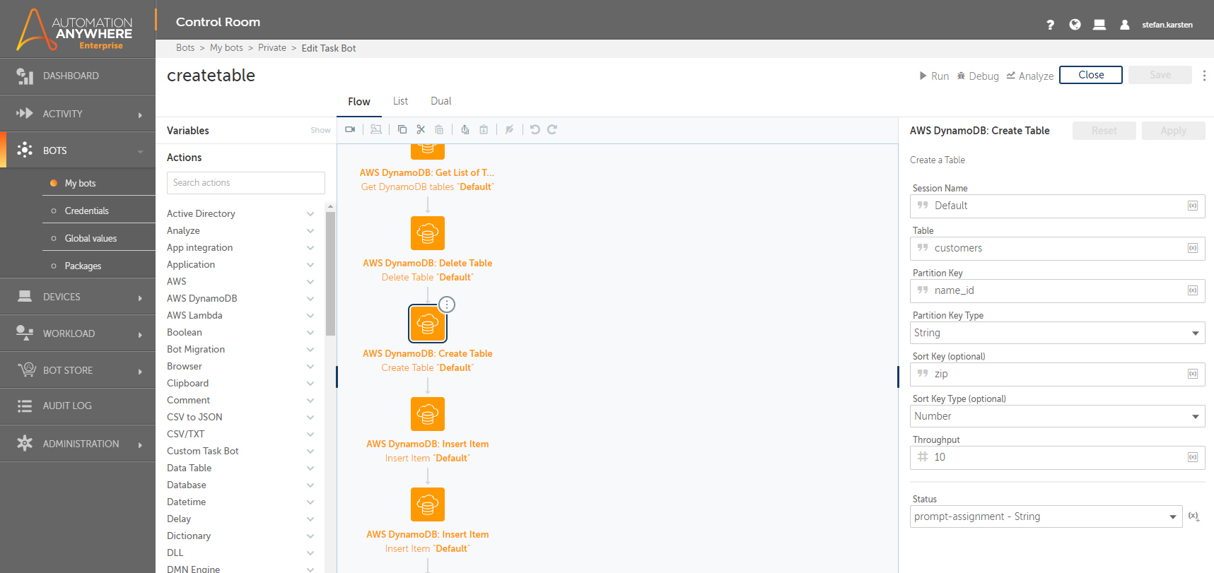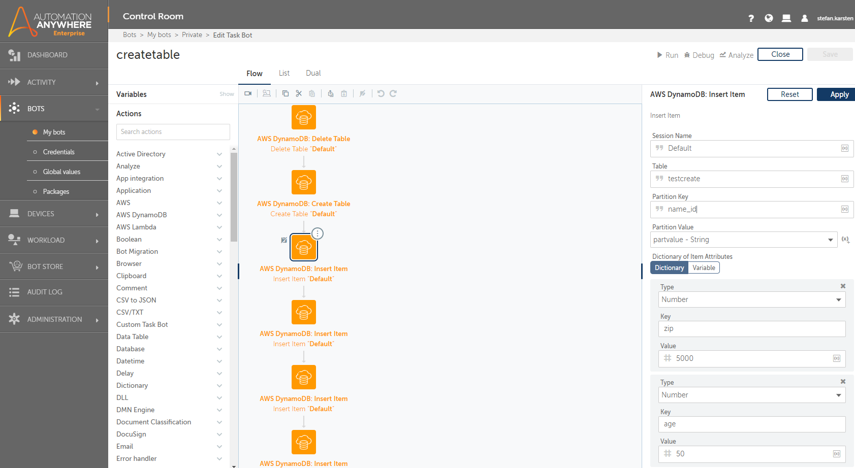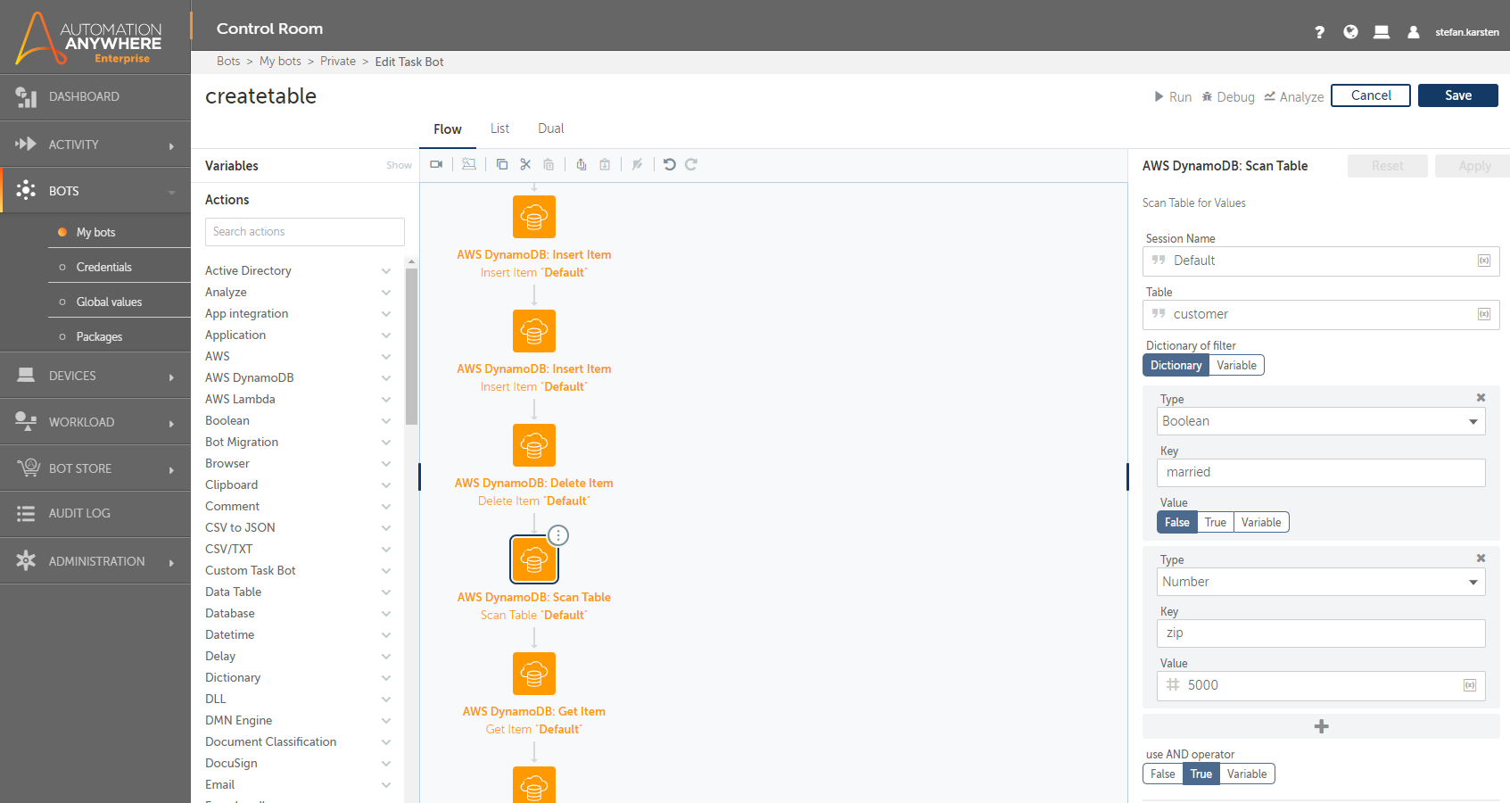 With the package actions you can build bots that create and delete AWS DynamoDB tables in your AWS account. This bot can insert, delete, read, and update items and scan for certain table items. Most actions support the JSON payload for input and output. You can use the JSON Parser package to convert the JSON data to a dictionary variable.