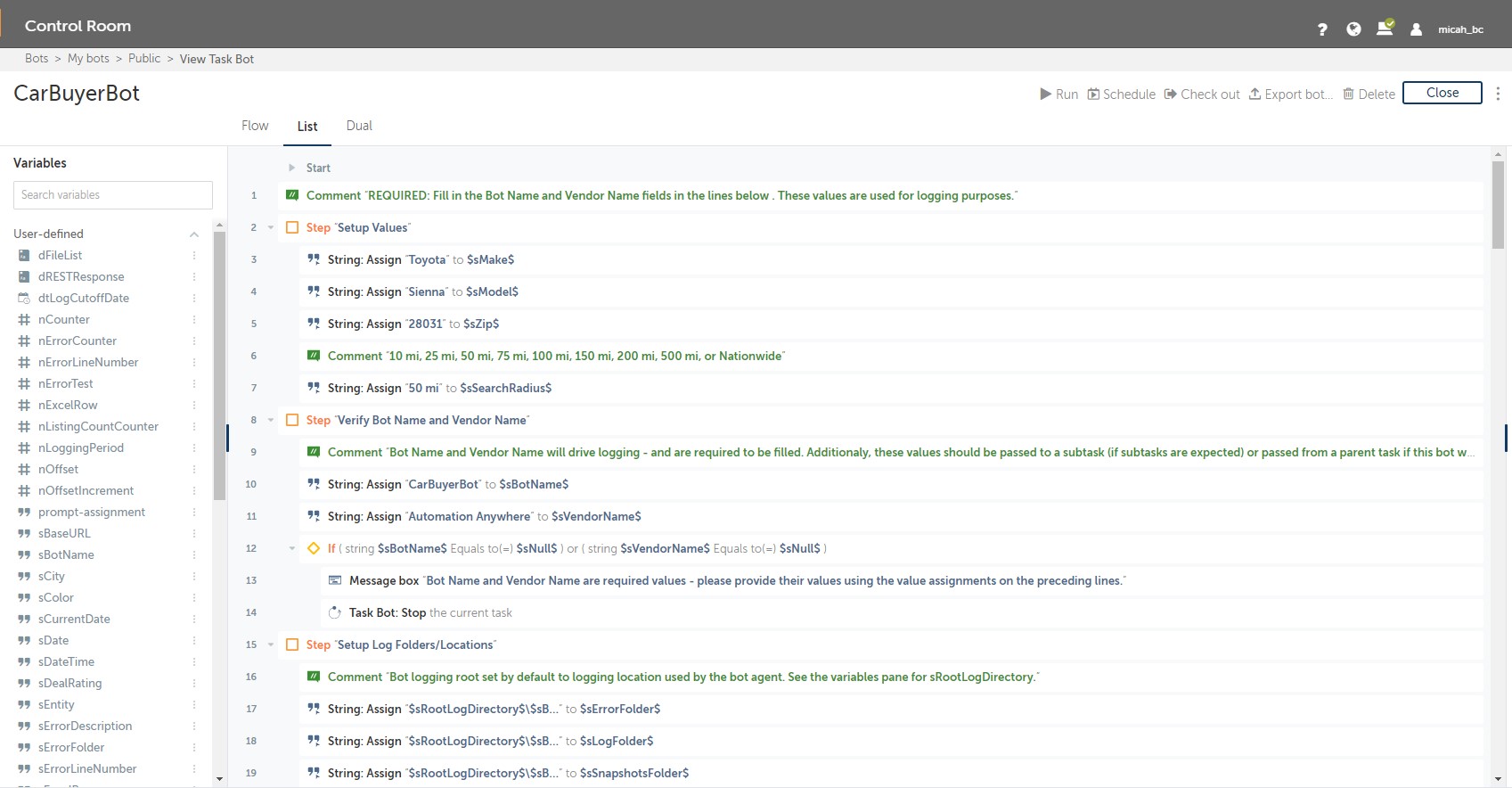 The only input values are made, model, zip code, search radius, expected life of a car (in miles), and page retry count. The bot will read these values from the input directory and execute the corresponding search on CarGurus.com