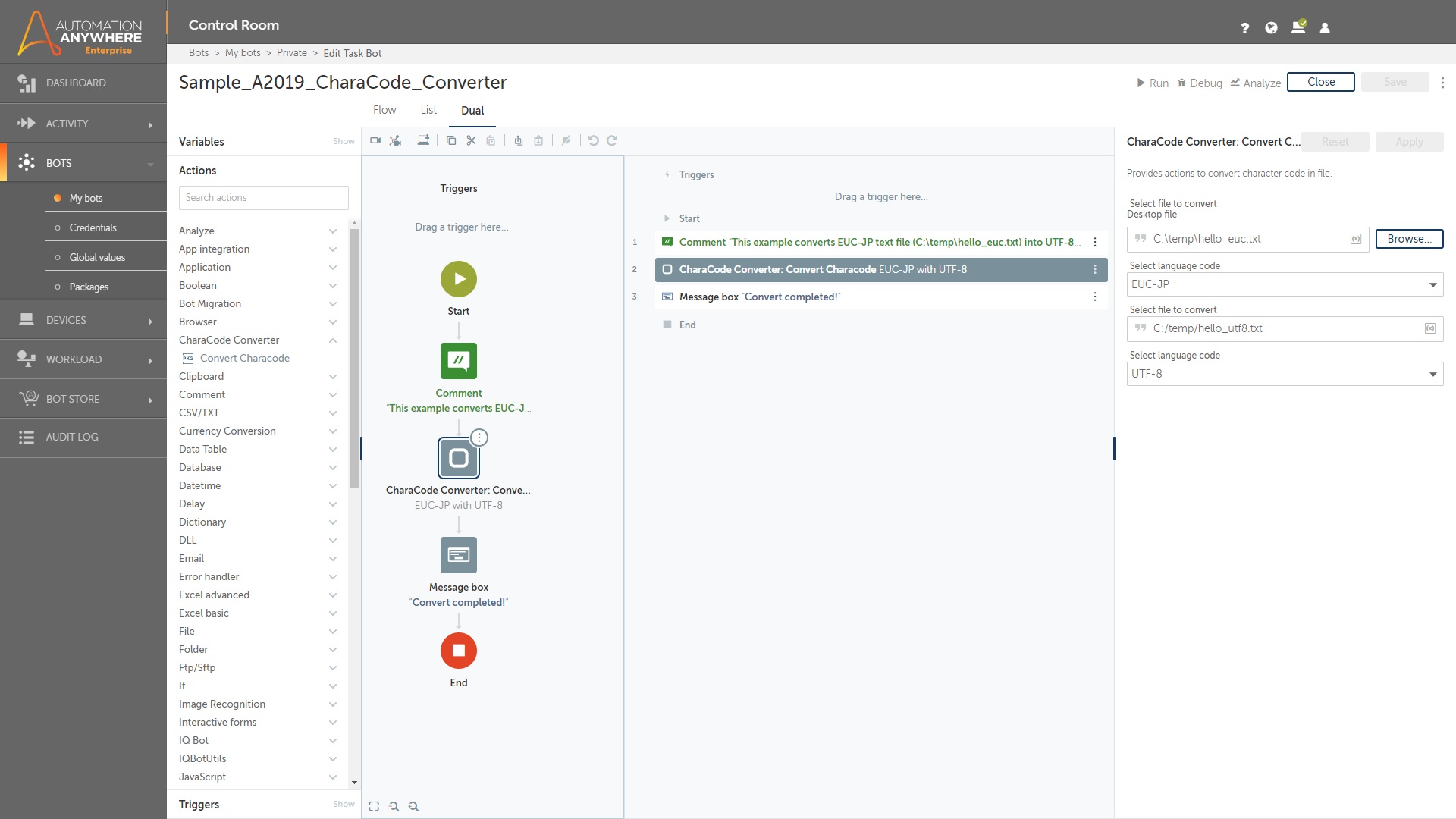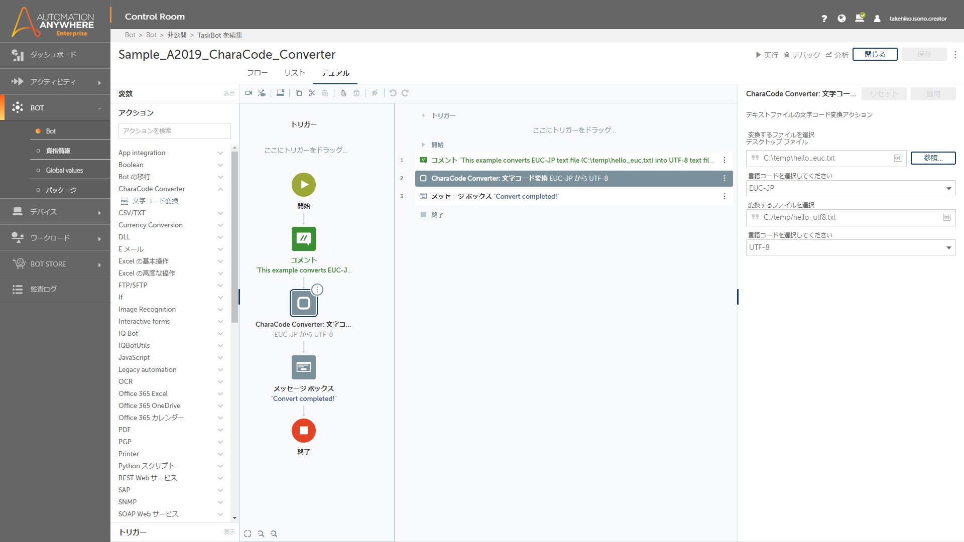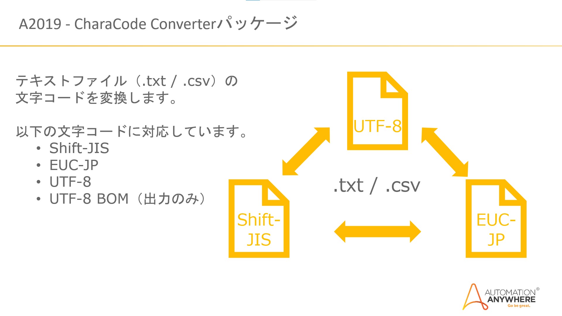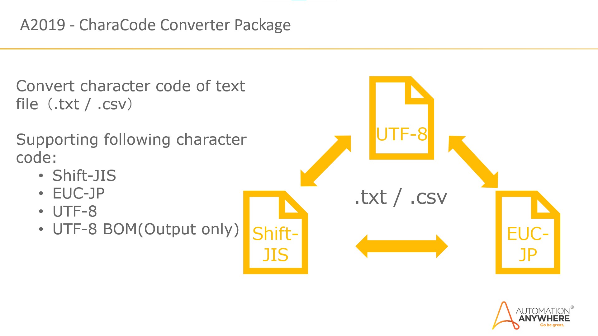 - Converting Shift-JIS data to UTF-8 for Automation 360 Text/CSV package processing.