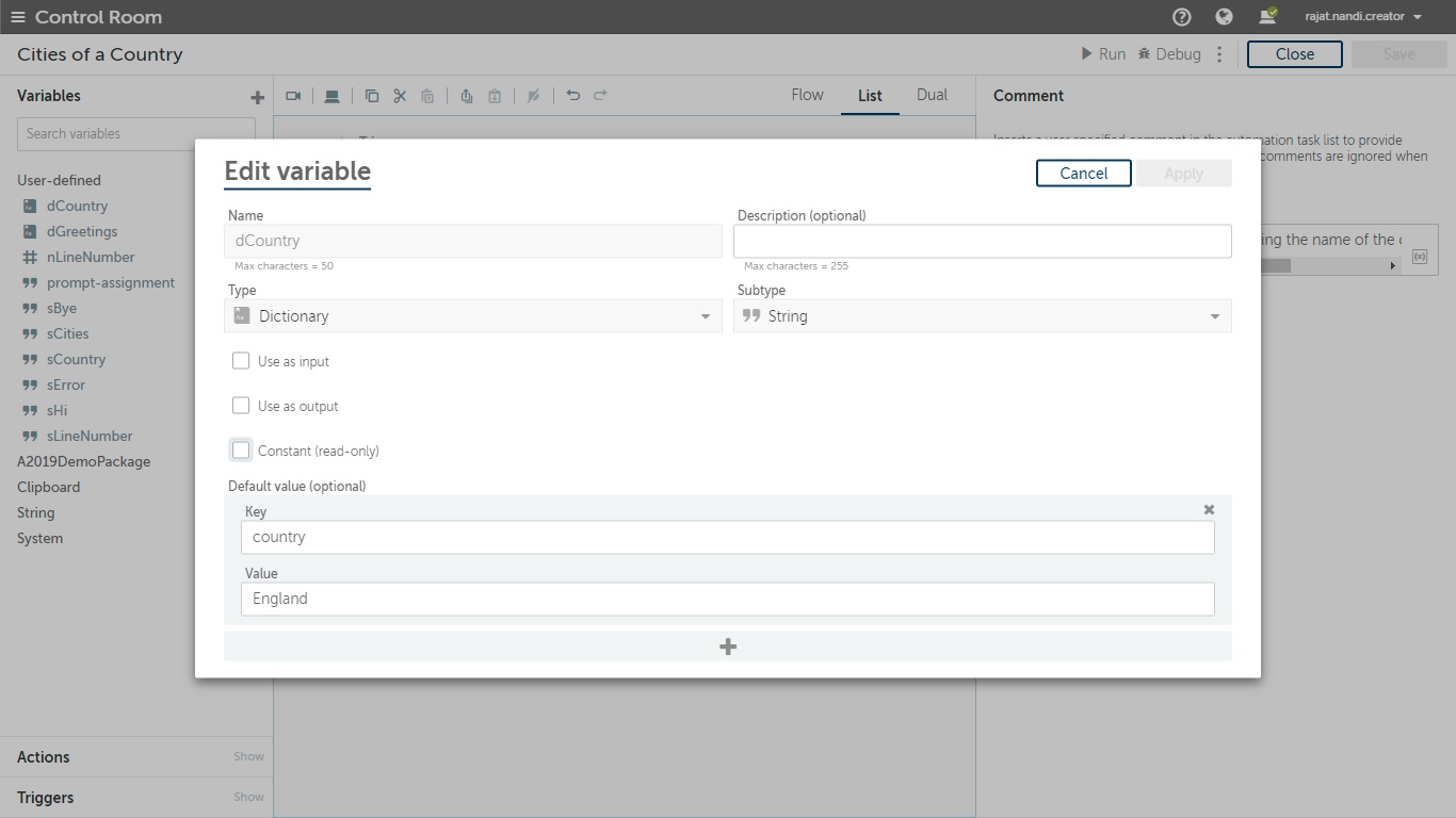 Just give your input value as a country in the prompt for value from the country you want to find the cities of as the output.