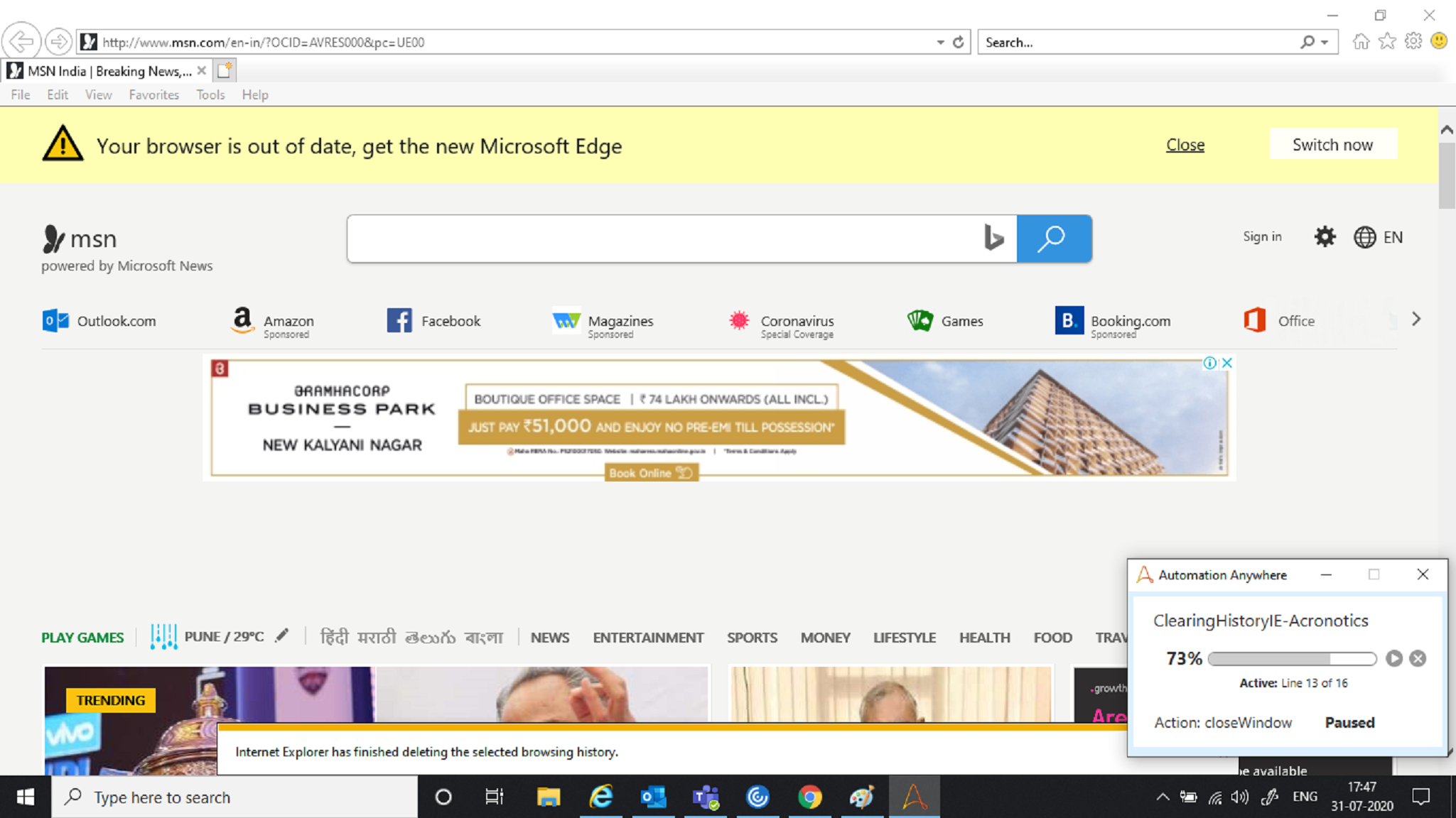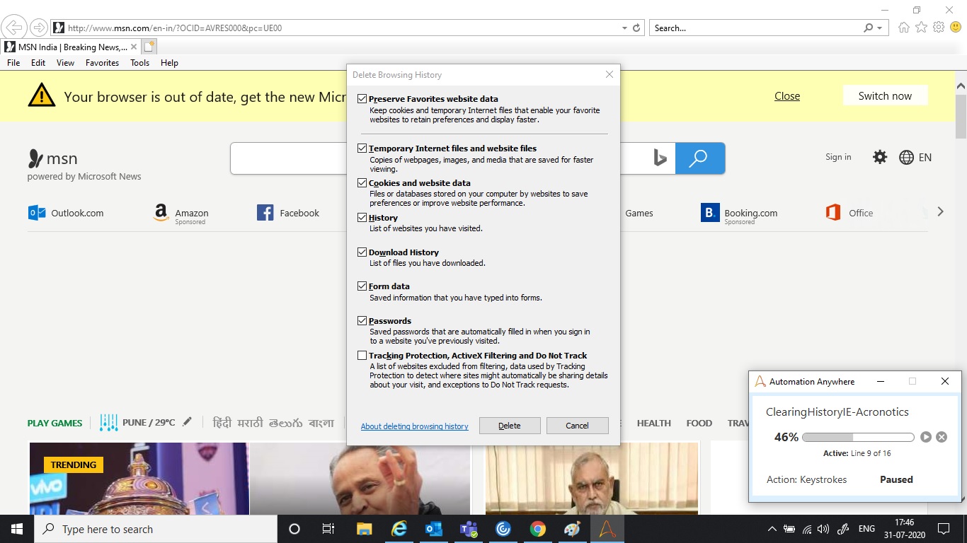 This bot will help to clear the cache and history of the Internet Explorer. It will help to reduce the failure of the bot. Using keystroke we can delete the history.