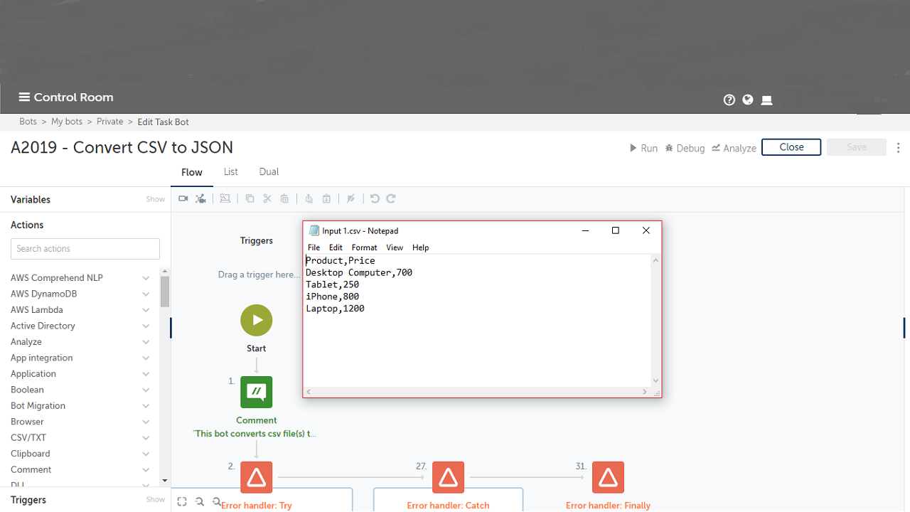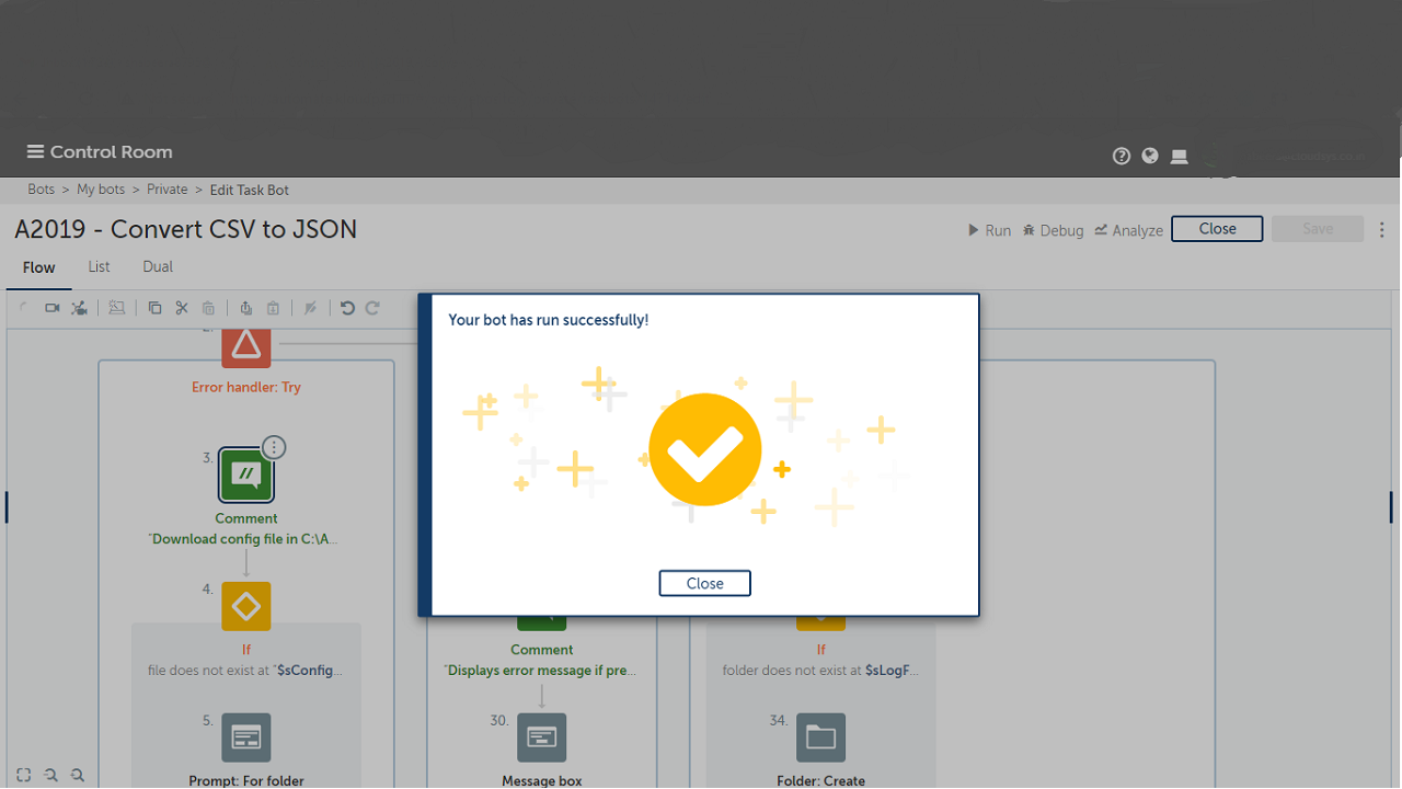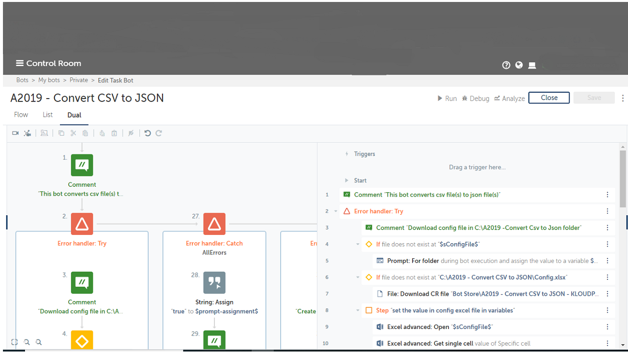 The bot is used to generate a JSON file from a CSV file. The Python script is used to convert CSV data to JSON data and also multiple CSV files can be converted. It passes the input file path to the Python function then converts the CSV file into a JSON file. It then stores the JSON files in the output folder with the same input filename. The converted file format will be the .json format.