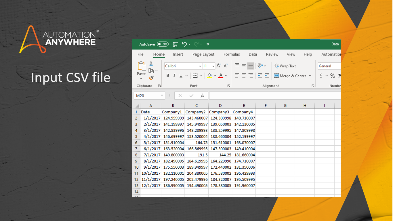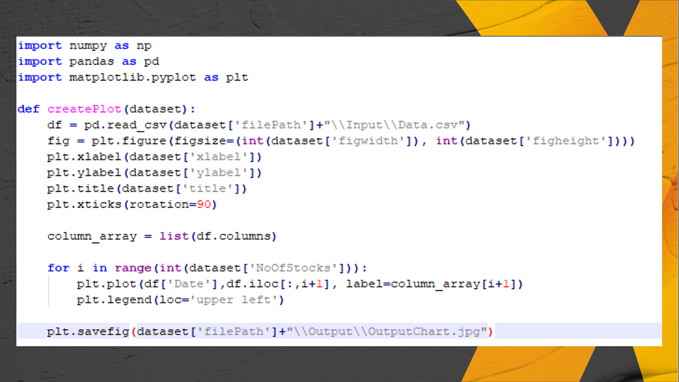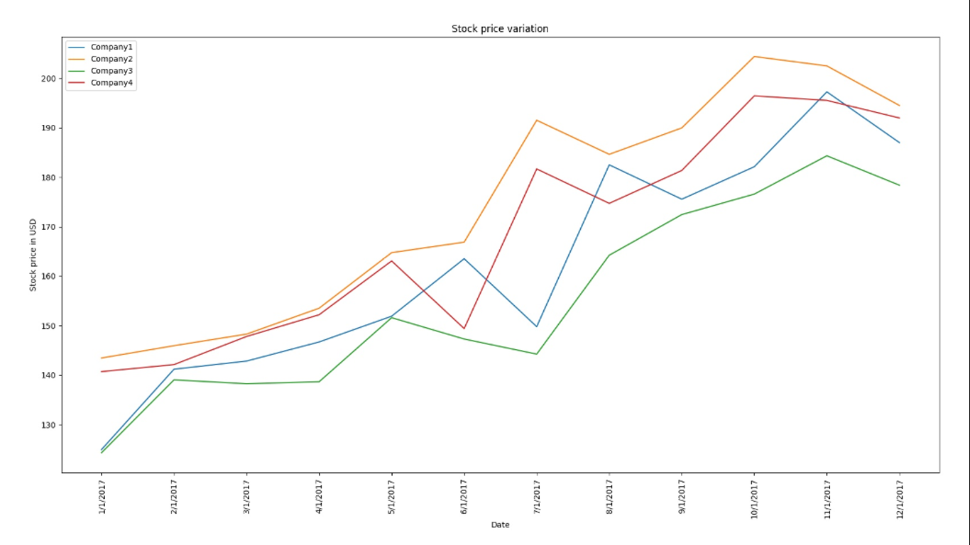 Input: Enter the data in a CSV file. In the Python code file, we have considered creating line charts for stock prices on different dates. You can download the CSV file from this link.