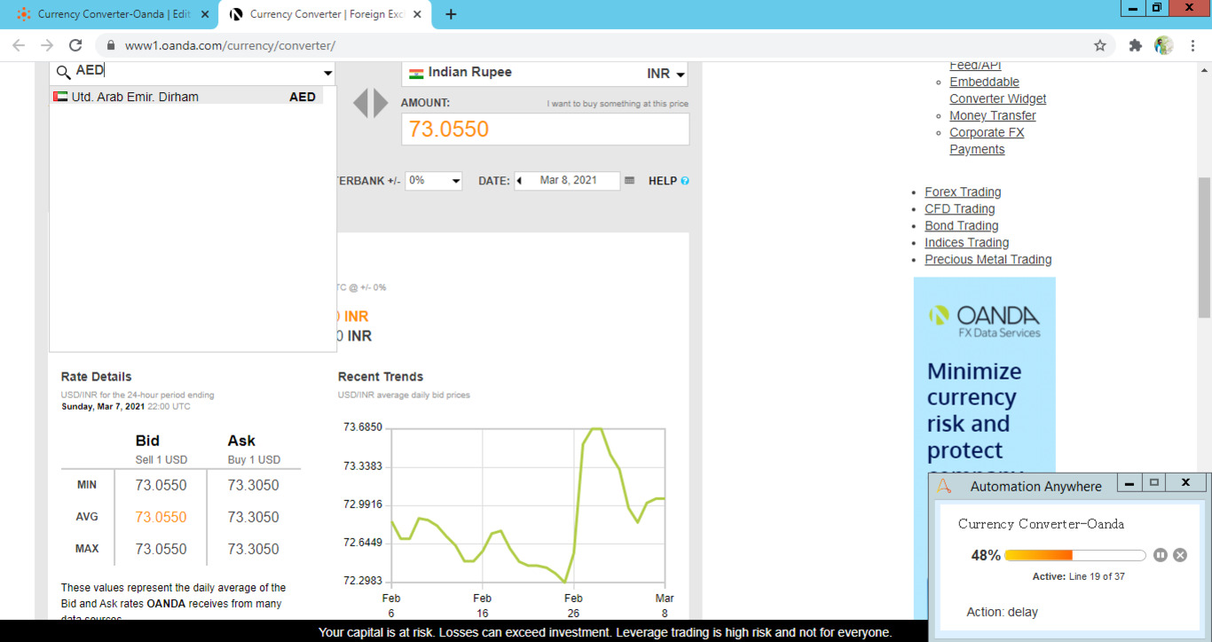 You have to provide an input Excel sheet that contains different country currency details. The bot will fetch the currency details and enter into the Oanda website and get updated currency amount details and store them in an input Excel sheet with the updated date. The bot will get all rates as per the given data.