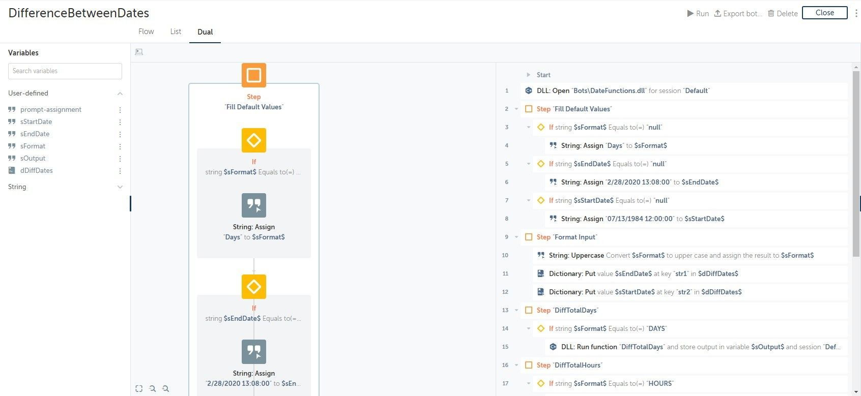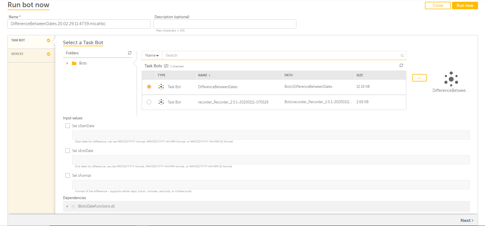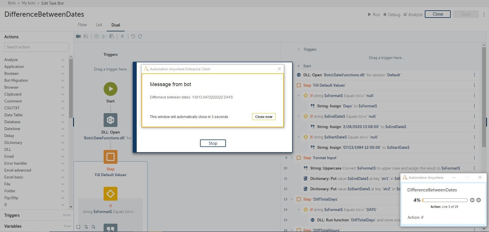 Use A2019 Date Differentiator Bot to determine the duration between two dates/times. The output can be specified in days, hours, minutes, seconds, or even milliseconds.