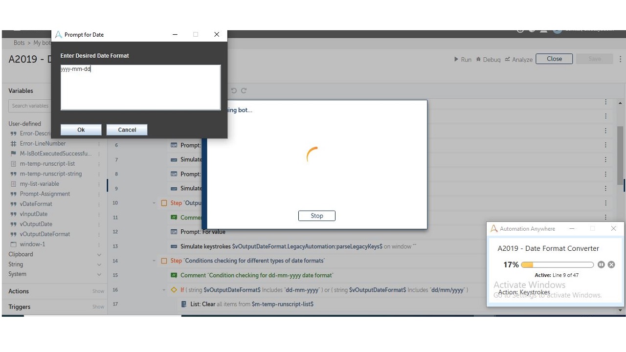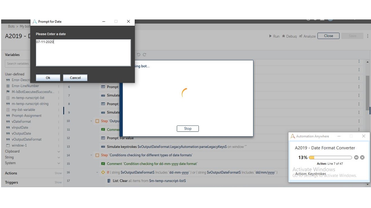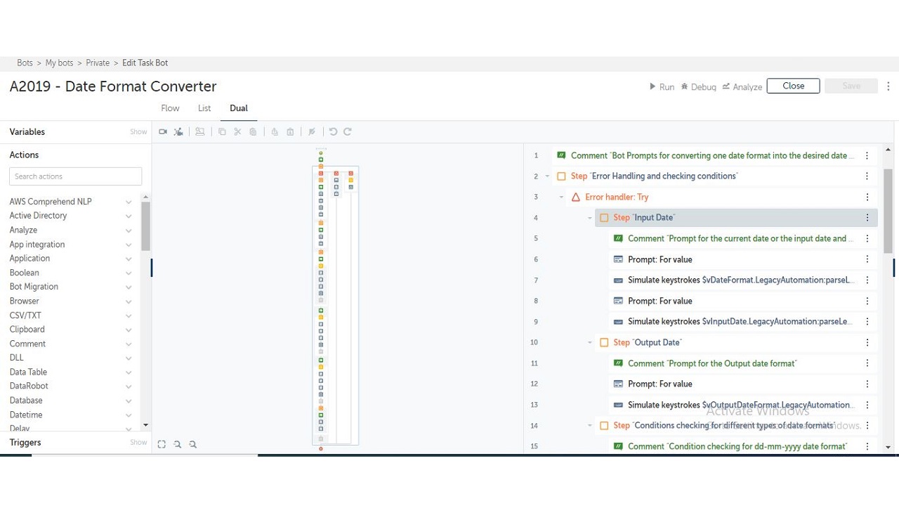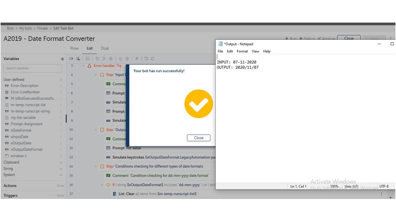 The bot is used for generating a user-defined date format. The user can prompt for a date, date format, and required date format. According to a given date format, it will run a script and convert it into the required date format. The standard date formats includes: dd-mm-yyyy, mm-dd-yyyy, and yyyy-mm-dd. After conversion, it will be displayed in a TXT file.
