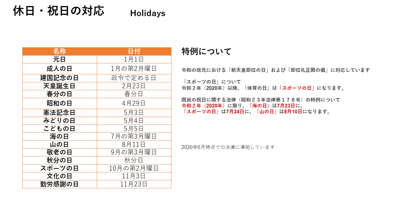 Judge whether it is a Japanese holiday or a public holiday, and use it as a criterion for processing.
