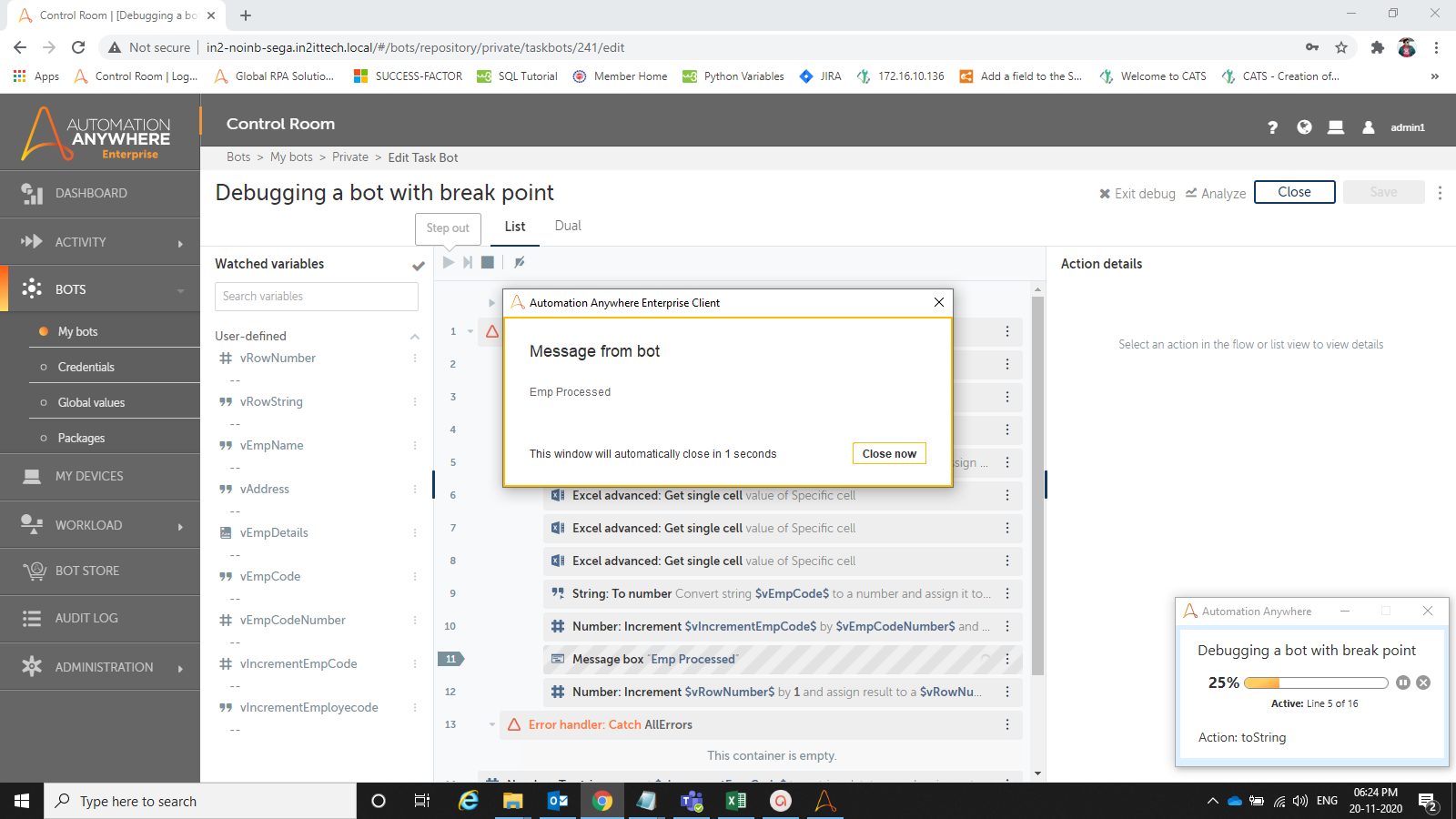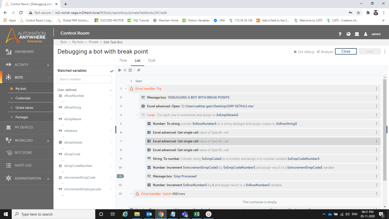 2. Based on the Excel data showing the movement of data which is stored in the variable, the bot will run through all the steps till a given breakpoint.