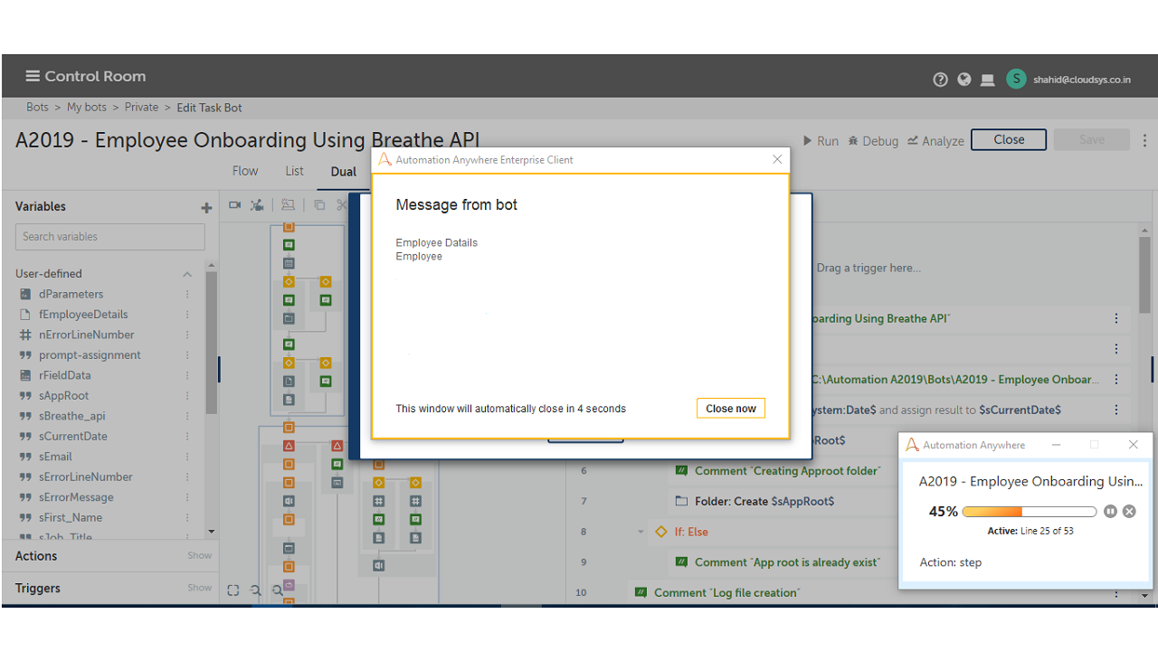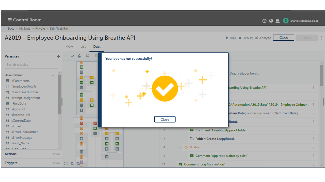 This bot reads input details from the required Excel sheet (Employee Details.xlsx) and updates those details in the BreatheHR using Breathe API. The bot will open the Python script and execute Python functions for Breathe API post. Uses the Breathe Server for creating employee details in Breathe HRM.