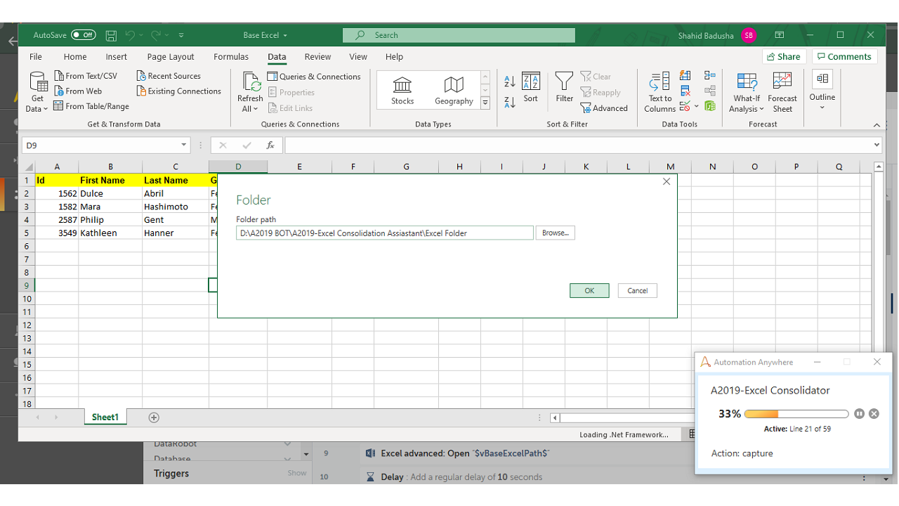 - The bot will open base Excel and reads the multiple Excel files in the specified folder