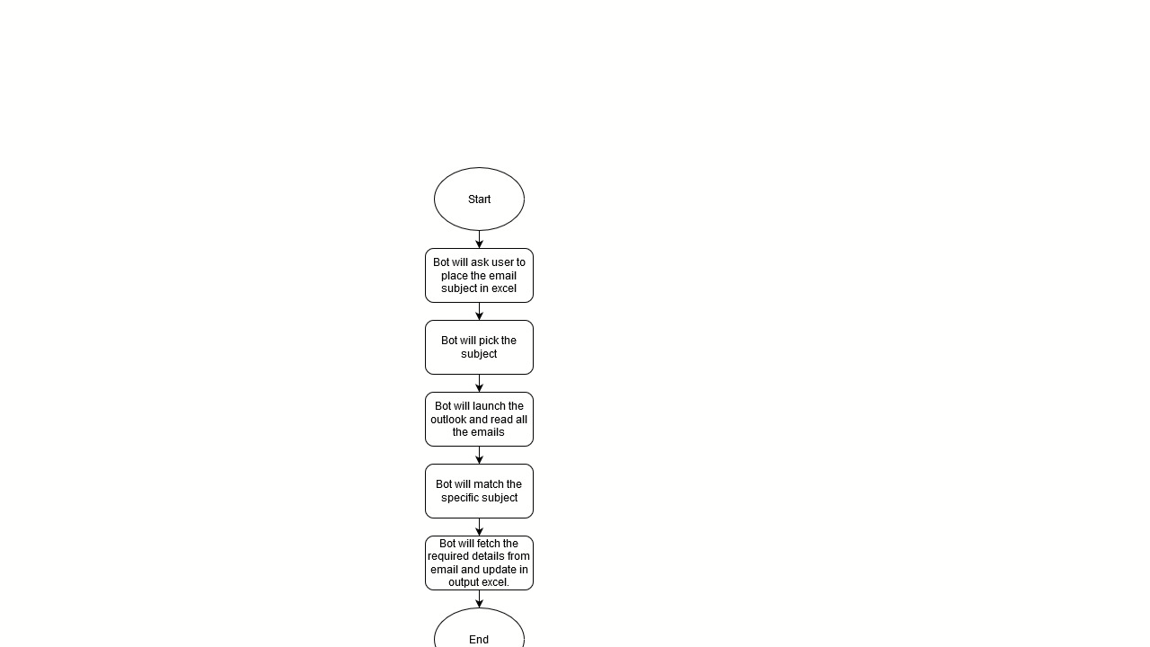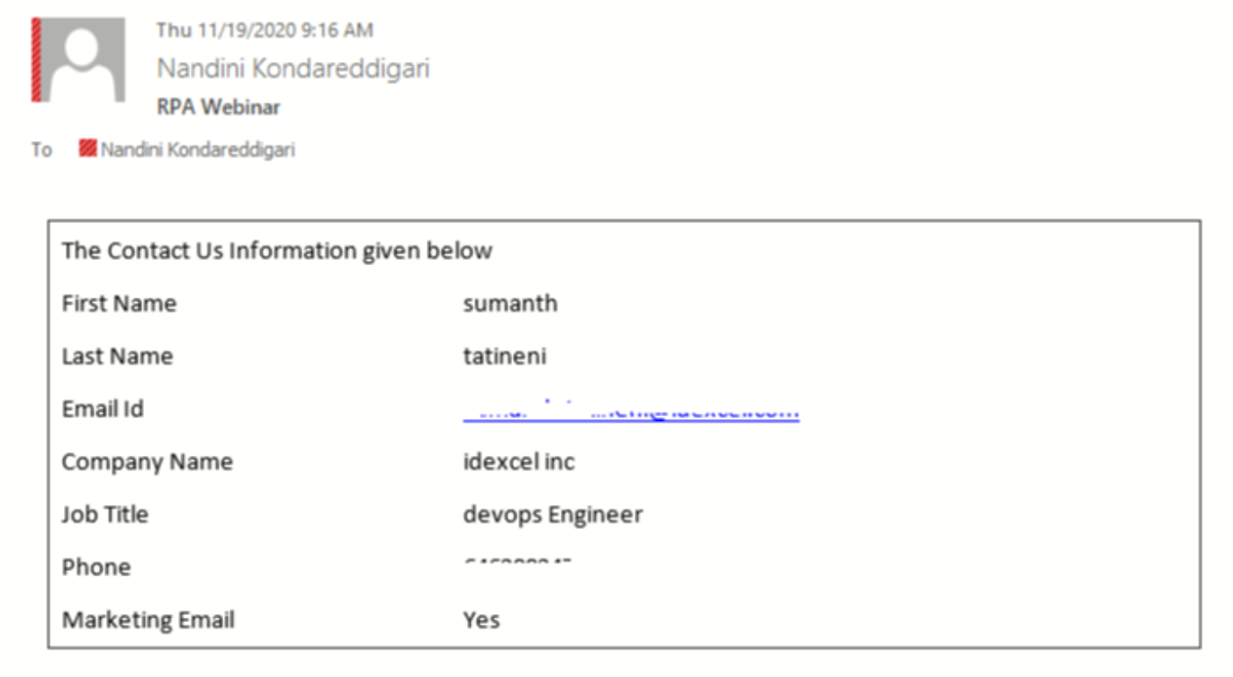 Here the bot will launch Outlook, pick the specific subject from Excel, and match that subject with the email subject. The bot then extracts the contact details from matched subject email and updates the detail in the output Excel.