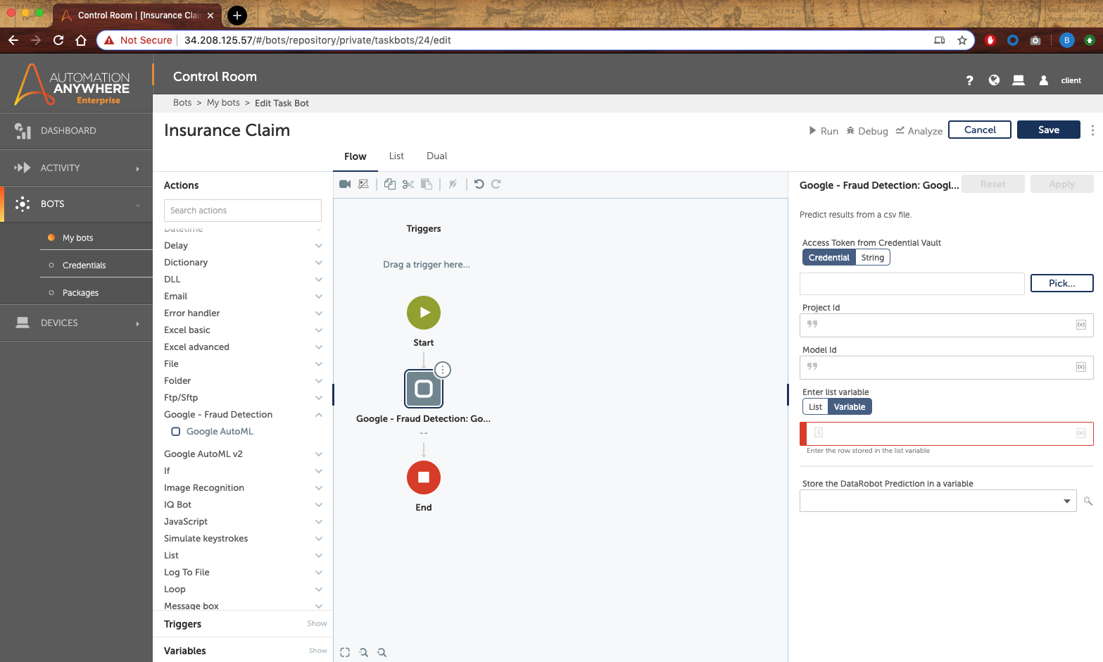The input is a CSV file with following information: name of the insurer, insurance number, address, date and location of accident. RPA will log into CMS to get more info about the claim and will send it to the Google AutoML package to detect fraud and determines the confidence.