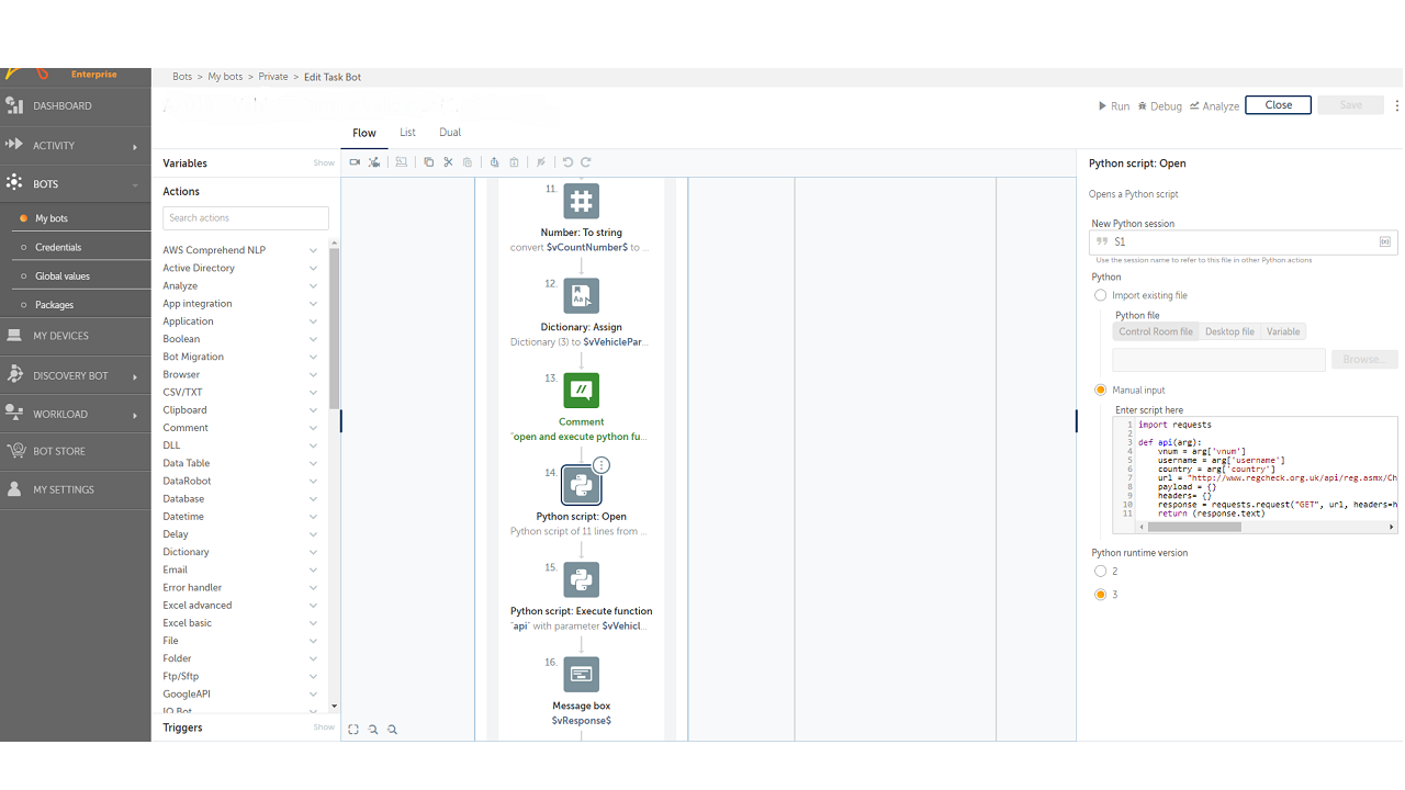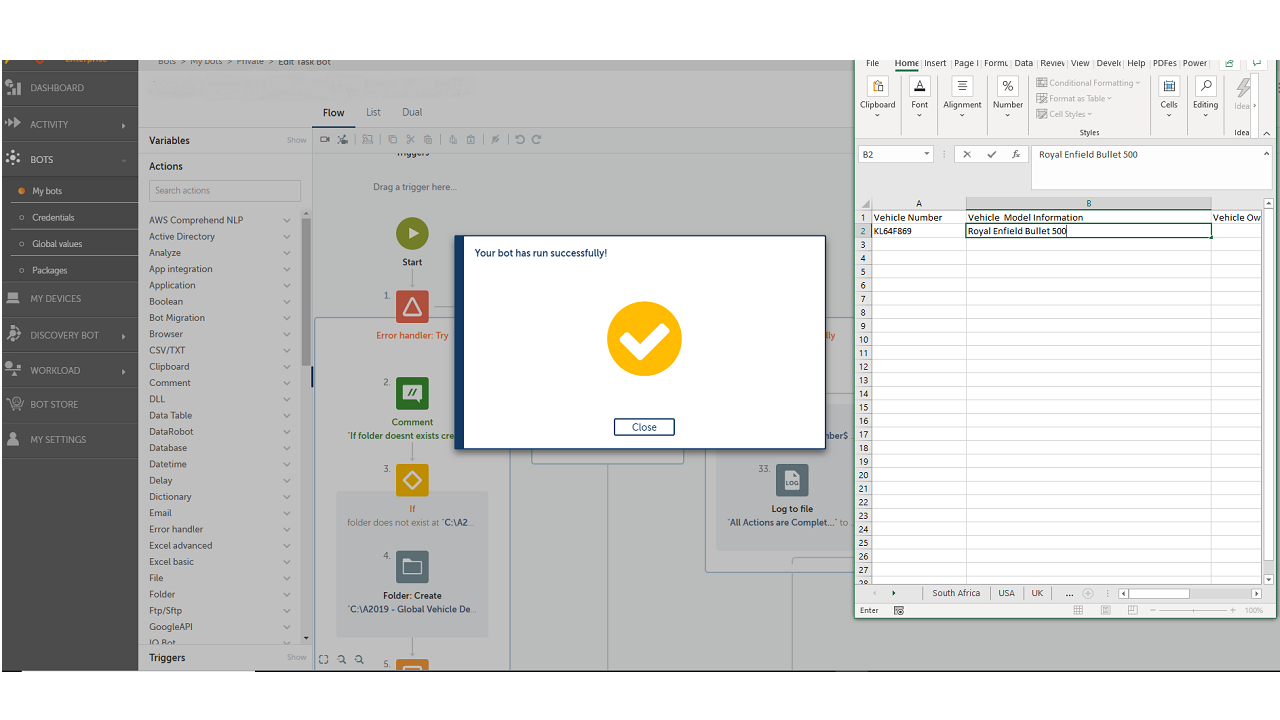 The bot takes an input Excel with vehicle registration number and populates the following details obtained as a response from the API Post function.