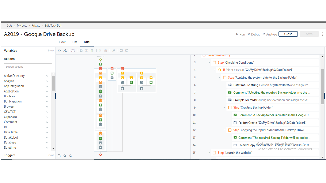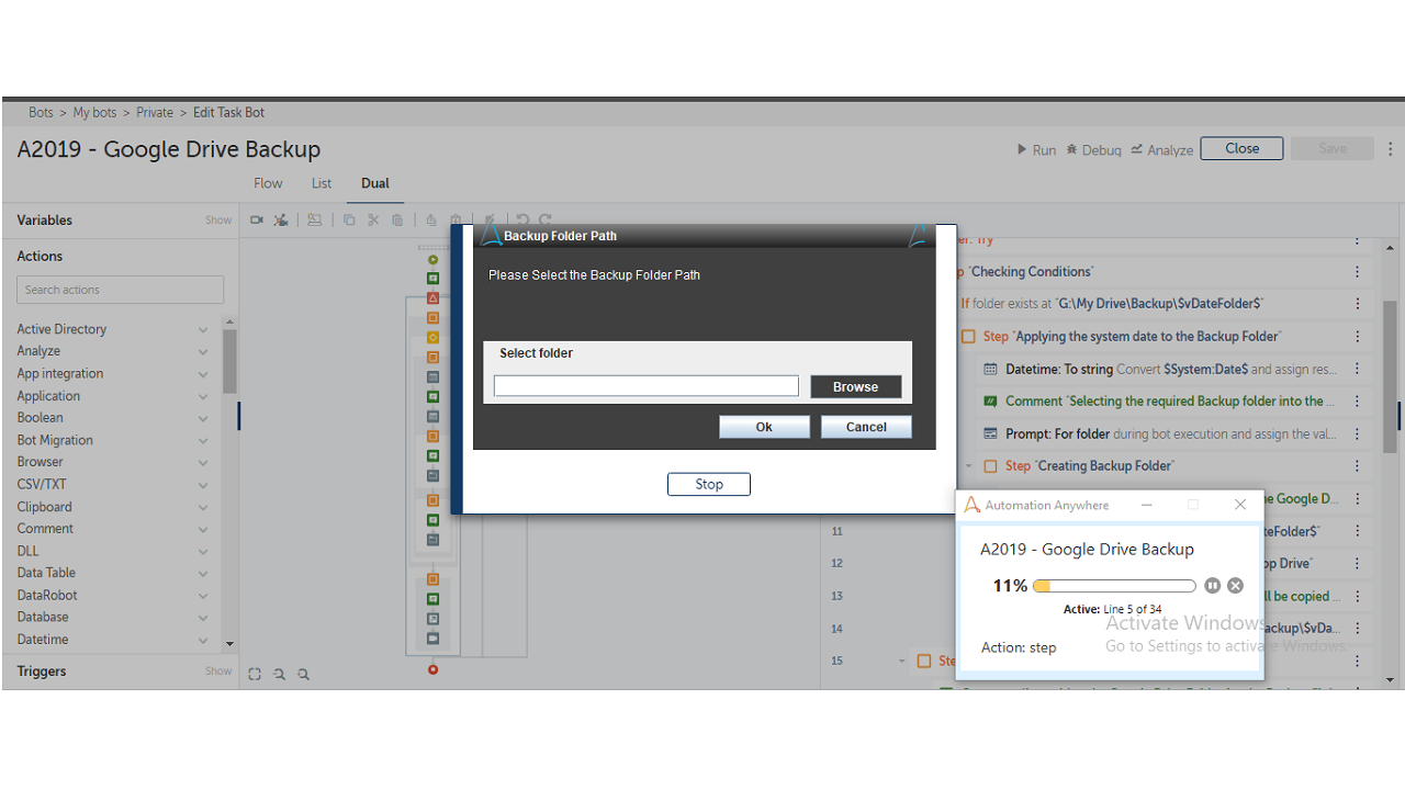 The bot prompts for the user to generate a backup folder with system date in Google Drive which is used to store files on their servers, synchronize files across devices, and share files, etc. It prompts for the folder path and selects the required folder. The folder will be copied and a backup folder will generate with the system data inside the pre-defined folder from google drive.