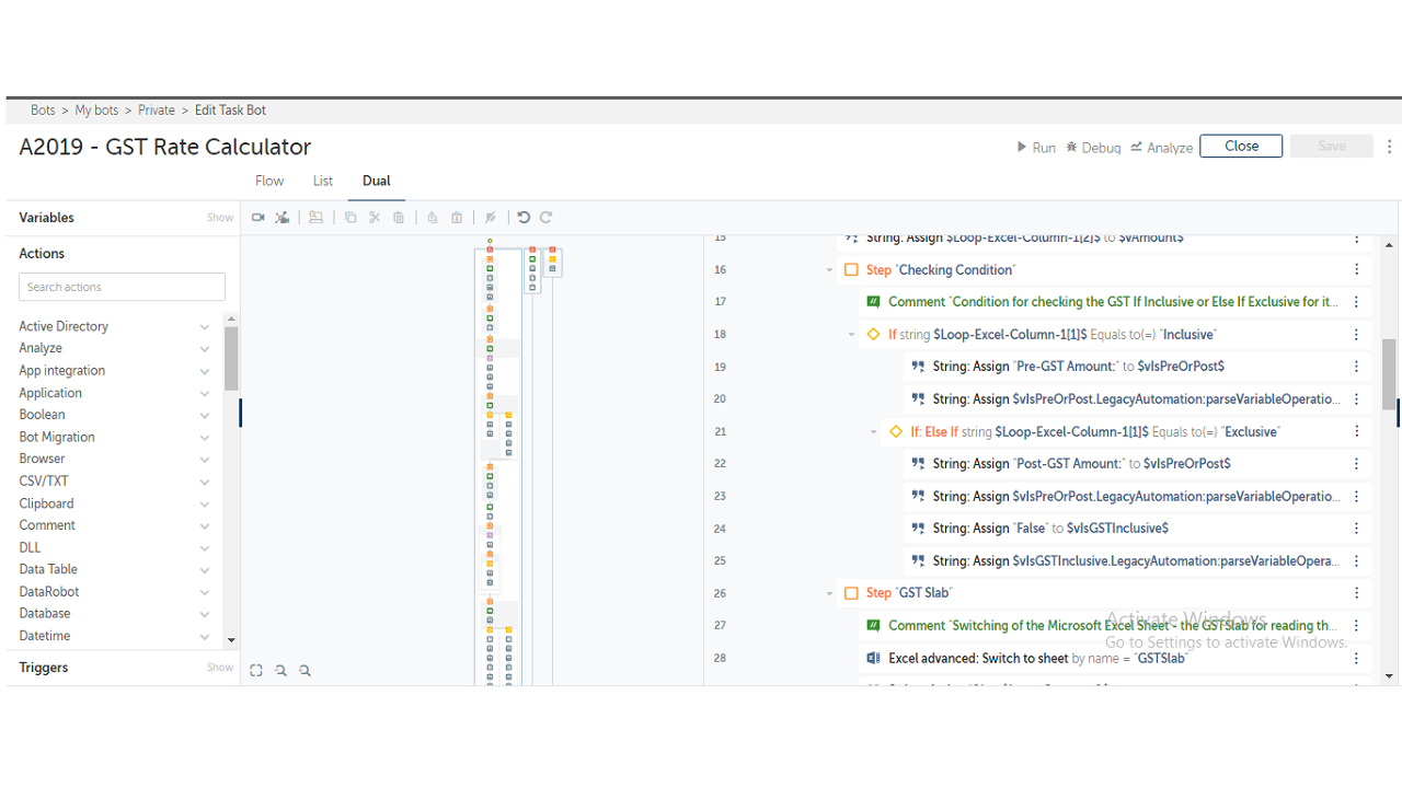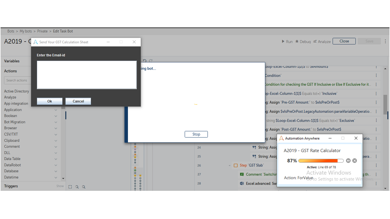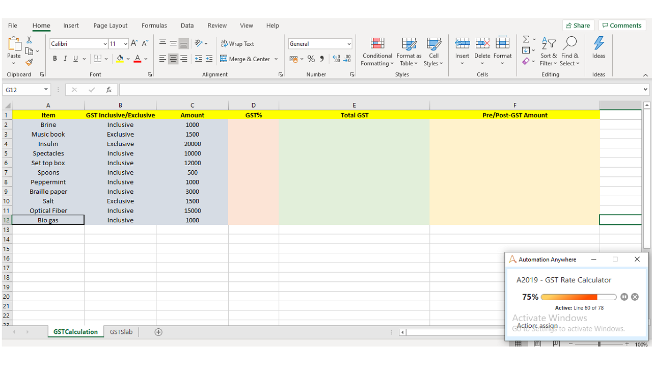 This bot prompts for the GST Rate calculation of items included in an Excel file. Input: an Excel file containing two sheets. First Sheet includes Item, Amount, and User prompts to GST inclusive/exclusive for the GST Rate calculation process or displaying output. The second sheet includes the GST Slab for comparing the Item and Tax Rate with the percentage. The calculation process will be done while the bot runs. Equations for GST Rate calculation are used. The output will be updated on the Excel sheet including GST%, Total GST, Pre/Post GST Amount. The Output file will be attached and sent to the user-defined e-mail address.