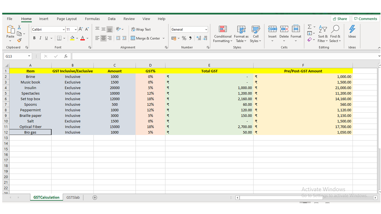 - Output will be updated in the same GST calculation sheet as GST%, TotalGST, Pre/PostGSTAmount