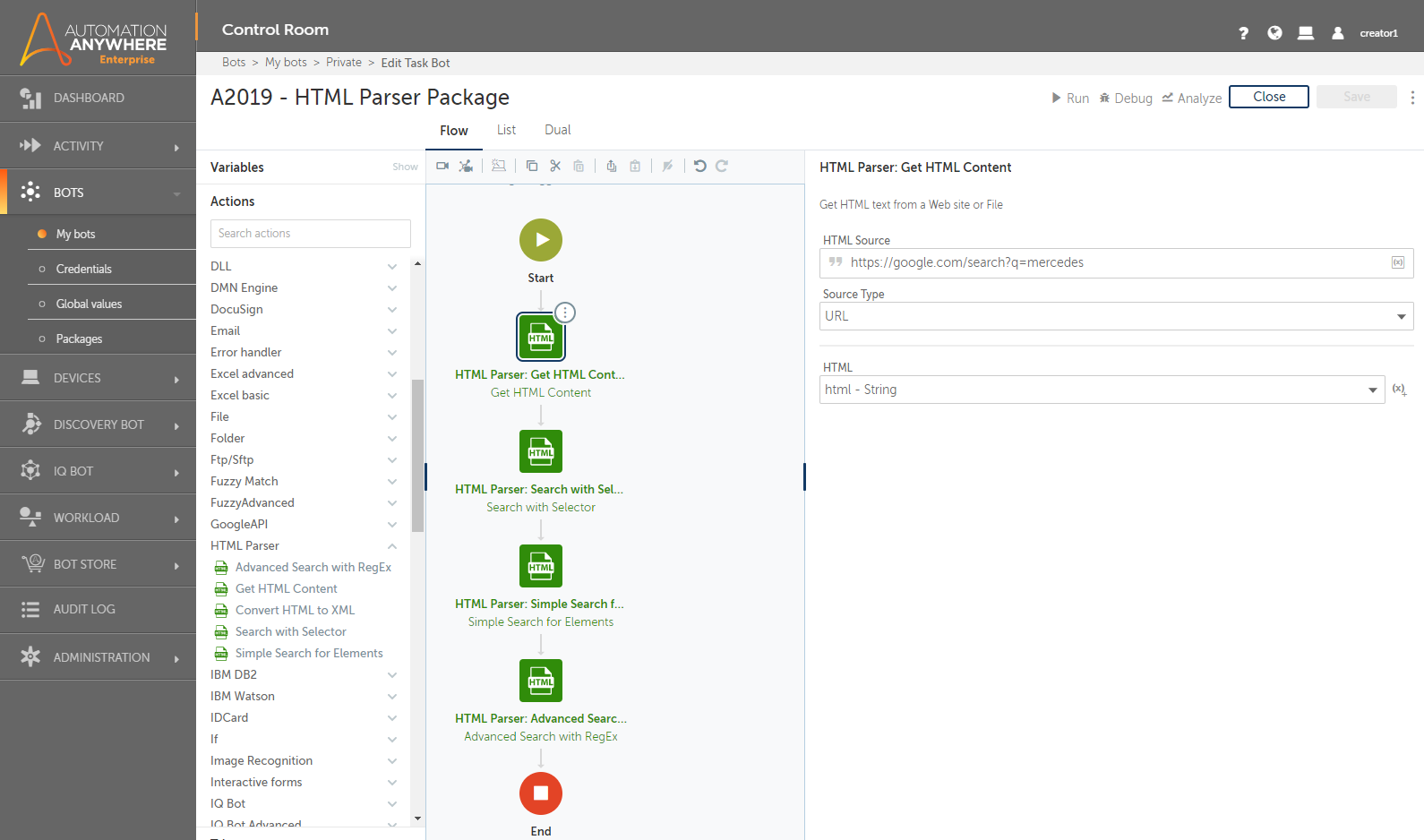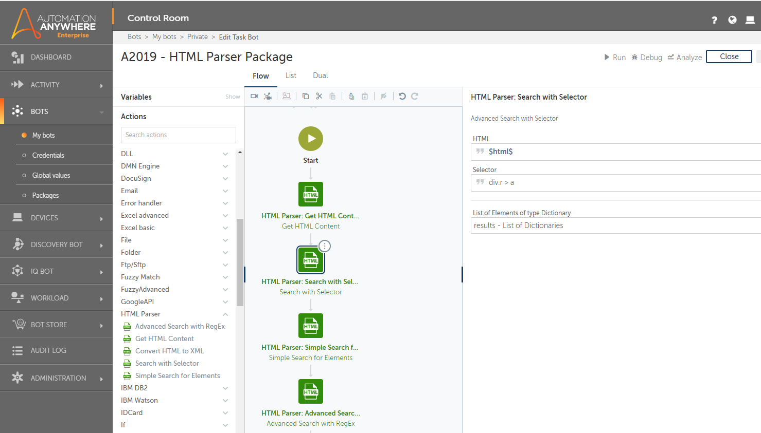 The package provides actions to retrieve HTML data with various filters and selectors from a string, file or webpage. The package is based on the Java libraries jsoup (https://jsoup.org) and HtmlUnit (https://htmlunit.sourceforge.io). There are various commands to search for HTML elements.