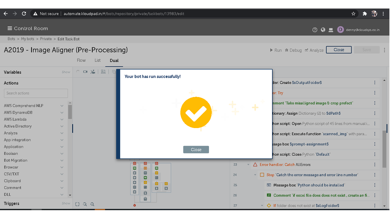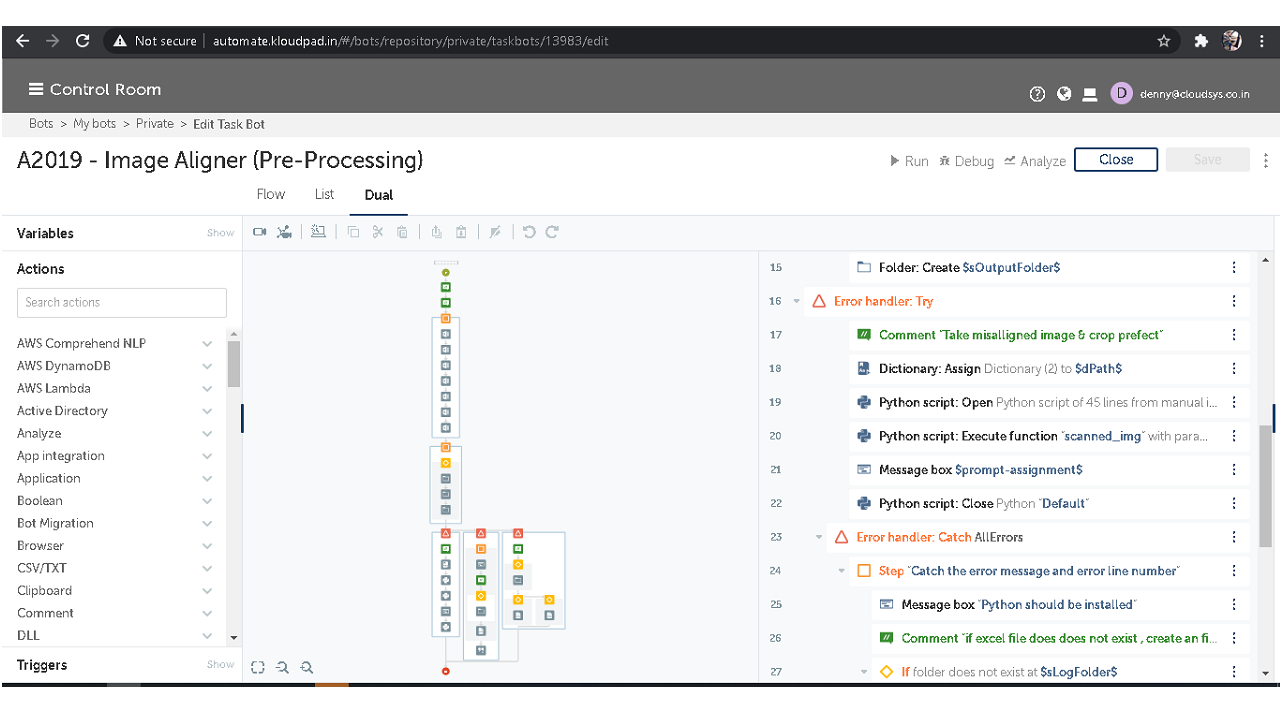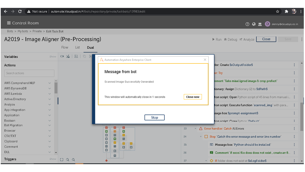 This bot helps with the preprocessing of images. The alignment, cropping of the images can be done according to the user's requirements. This can be mainly used as a preprocessing tool for the IQ Bot. It is an efficient processing bot that can be scheduled to run at any time.