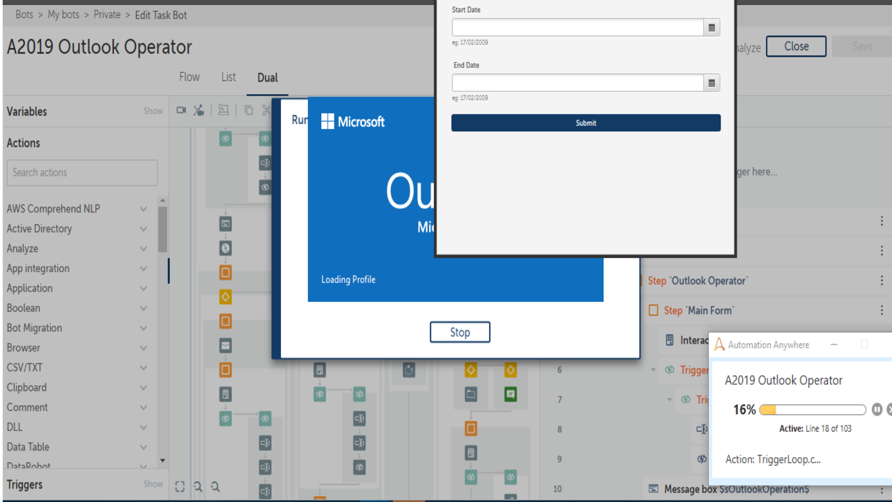 The bot mainly performs various automated Outlook operations. It iterates through the appointments of the user according to the input date, displays the appointment details in a message box, and saves them into a CSV file. It reads the emails of user based on specific date range and subject, then displays in a message box. The bot will create appointments for the user according to the input. User inputs the appointment date, duration, and subject through an interactive form. It helps to download attachments based on email subject and extension specified by the user.