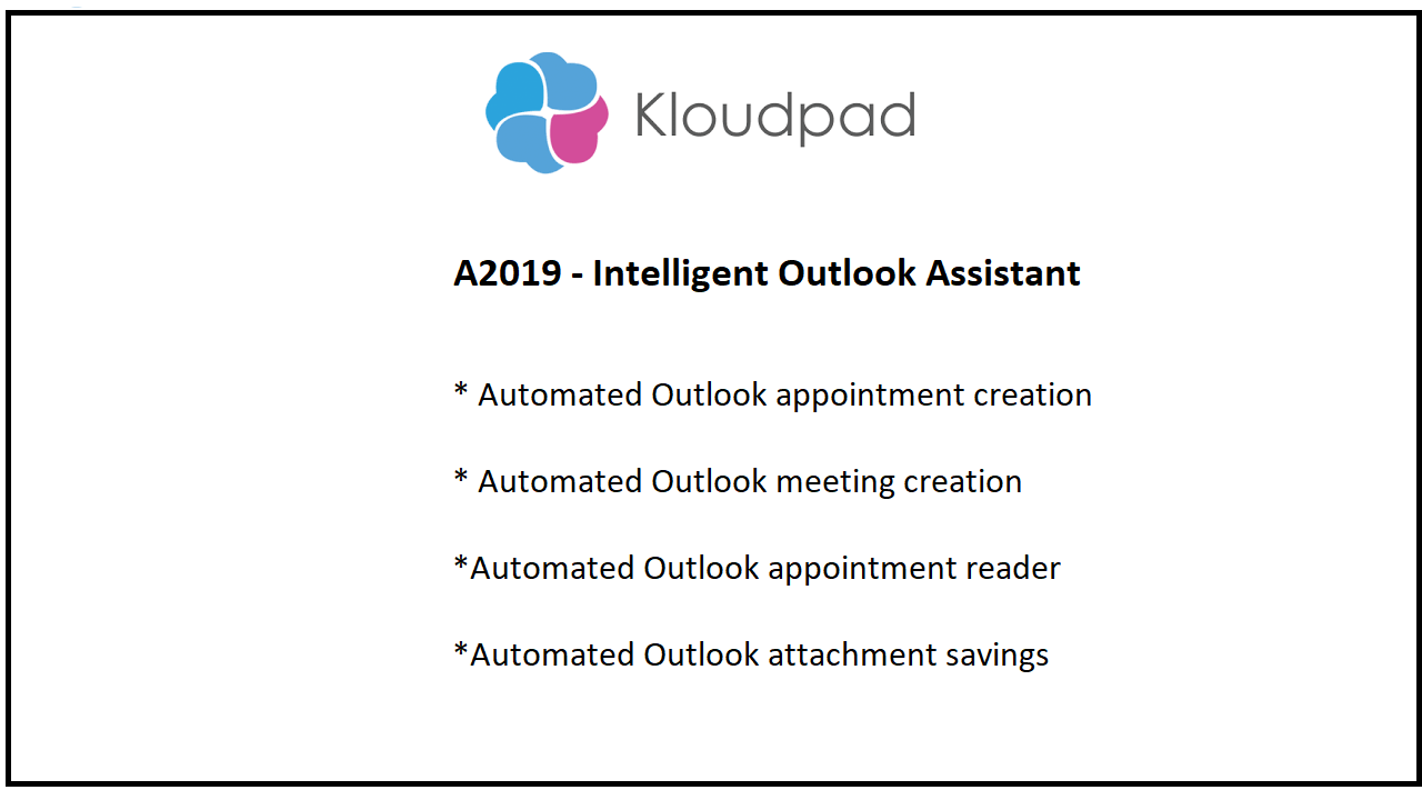 This bot performs various Outlook operations, including Outlook appointment creation, meeting creation, appointment reader, attachment savings, etc