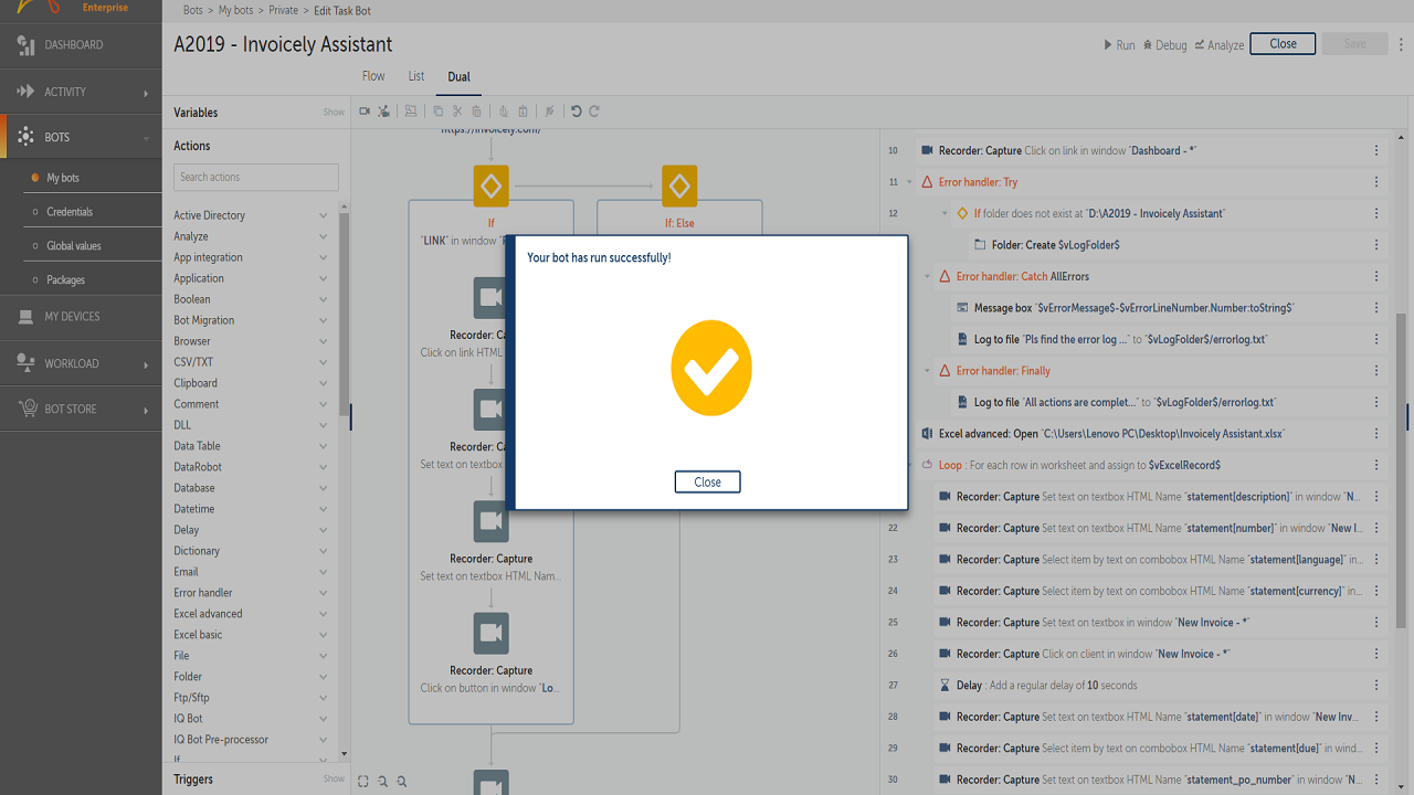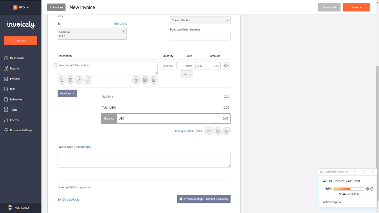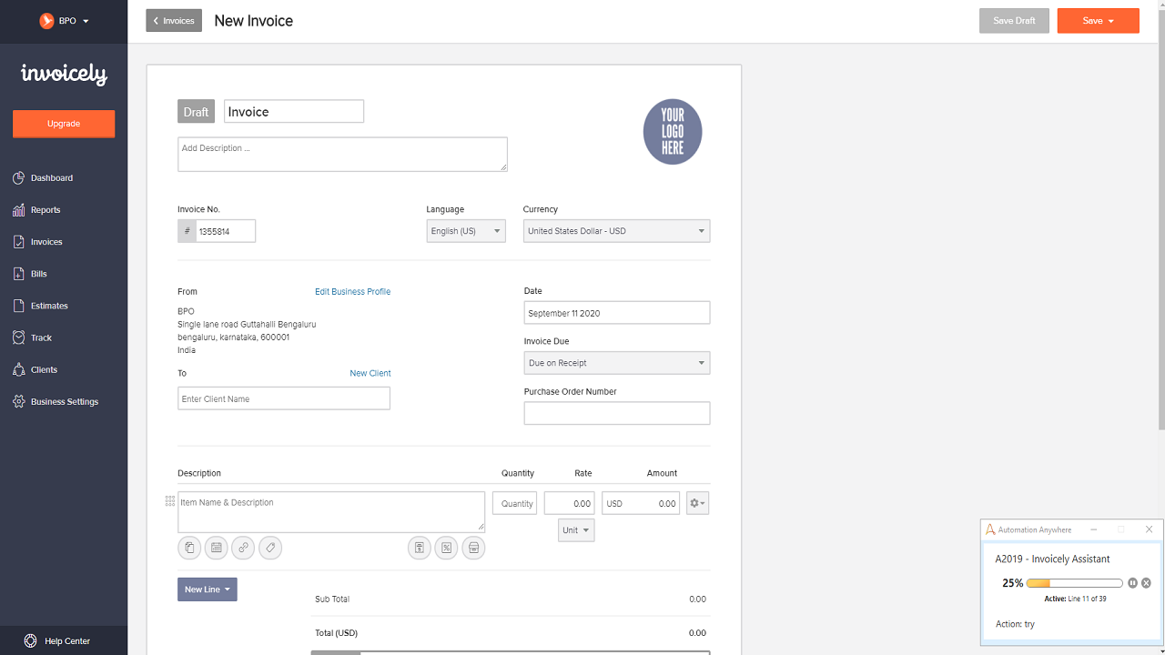 The bot logs into the Invoicely account of the user and creates invoices for the user. The invoice form is populated from an Excel sheet in which all details are predefined. The bot can be scheduled to run unattended.