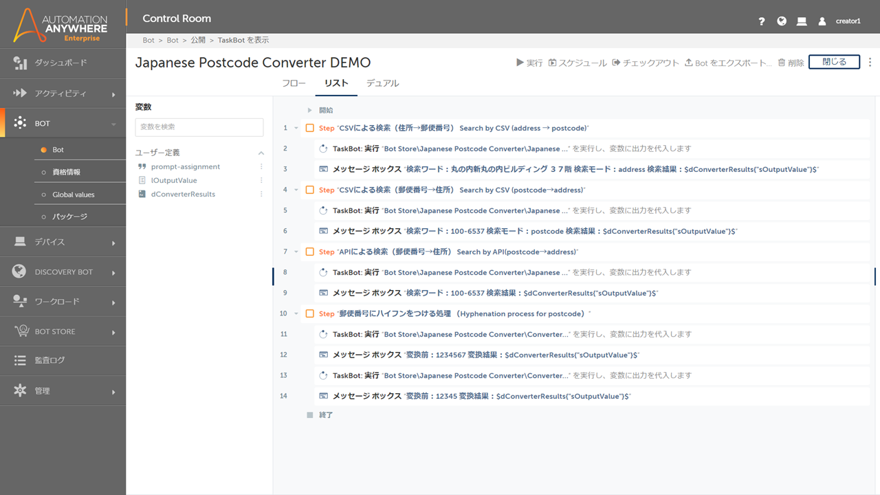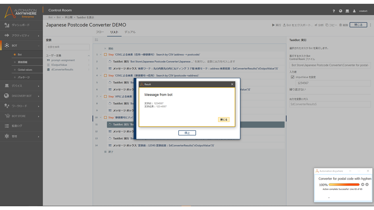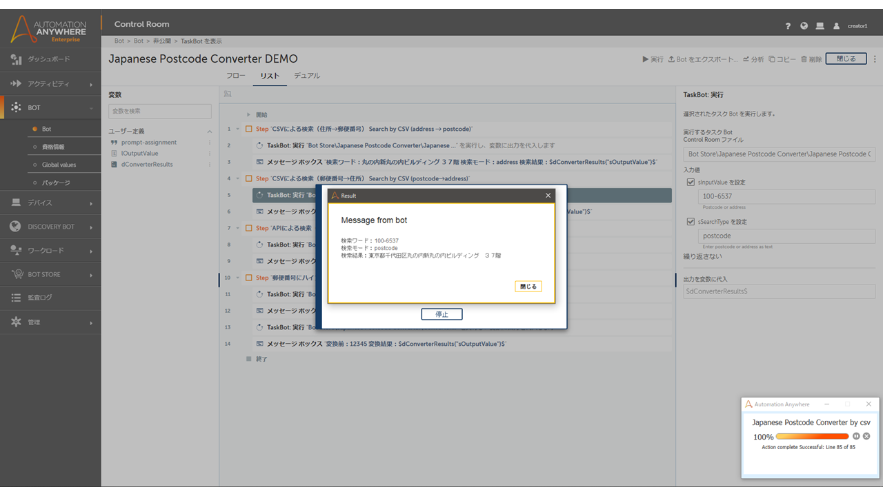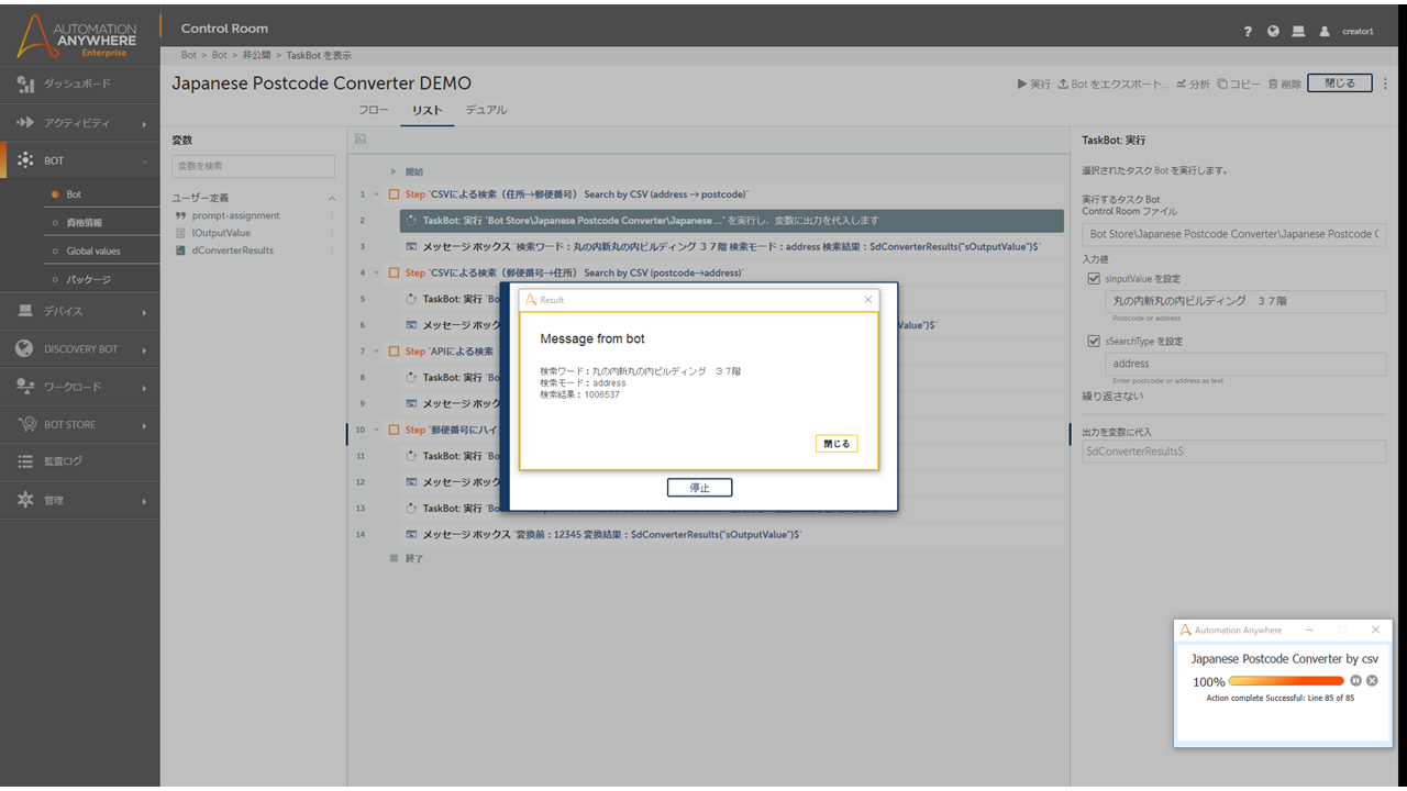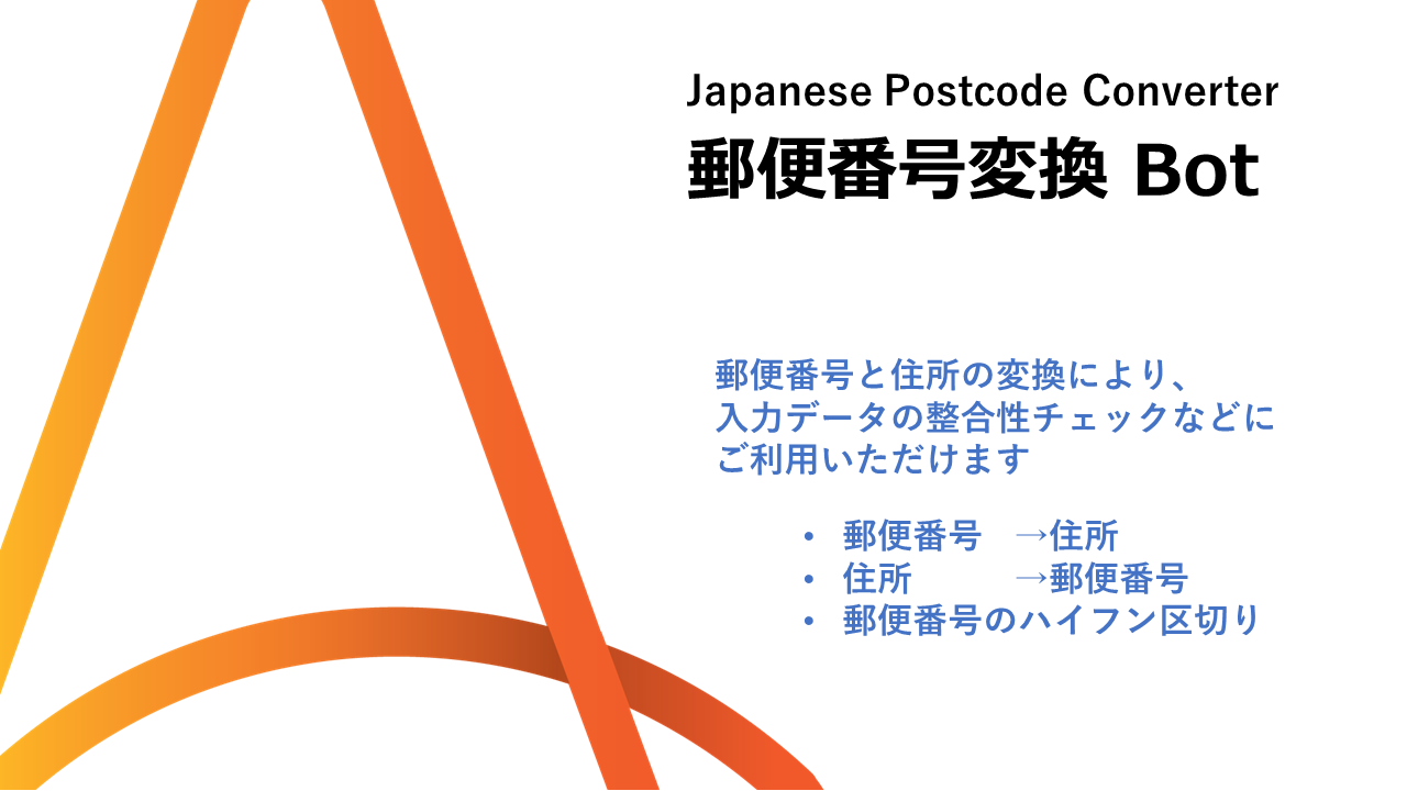This Bot converts Japanese postcodes or addresses into and out of each other. It can be used when searching for a match between the postcode and the address included in the data such as the application form.