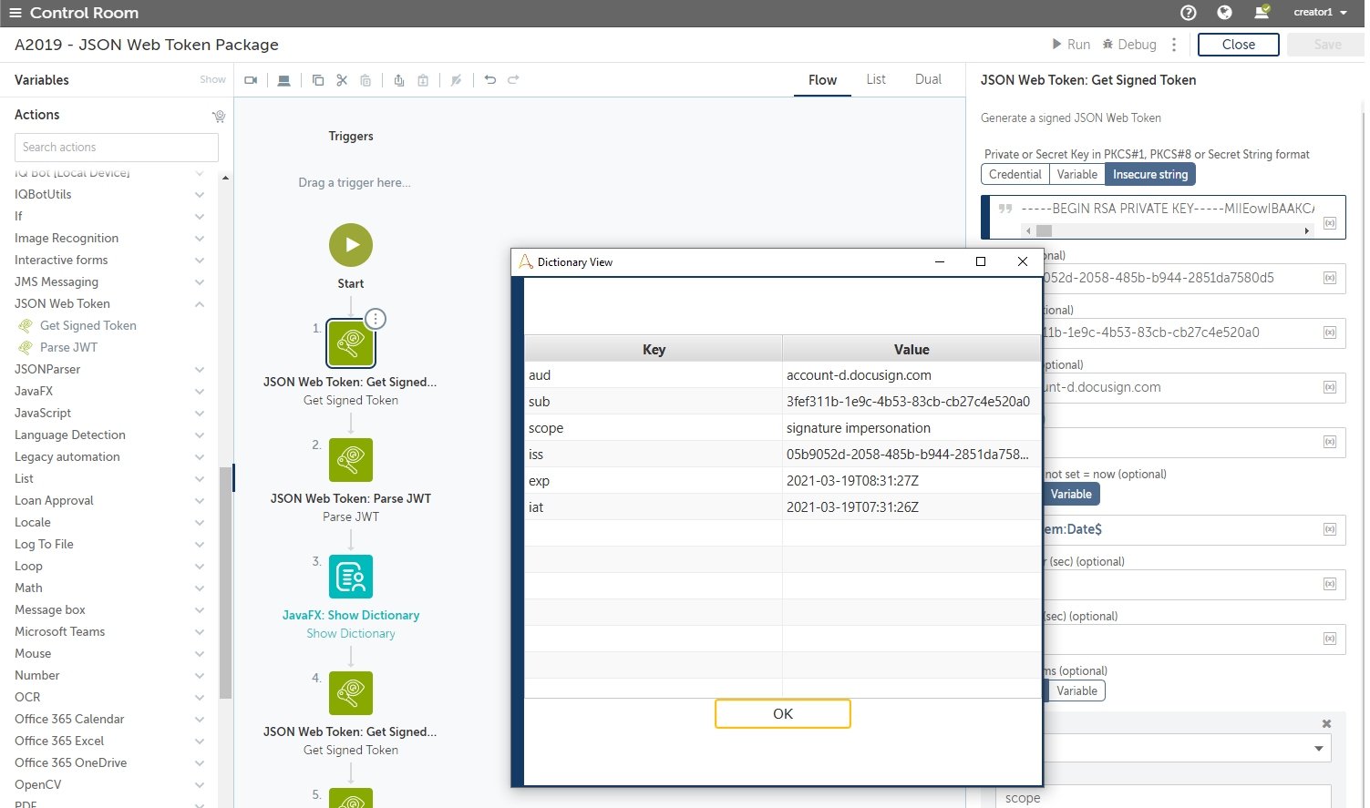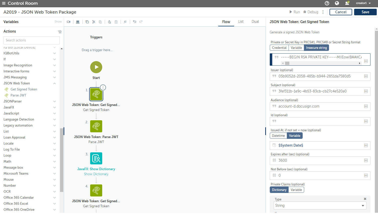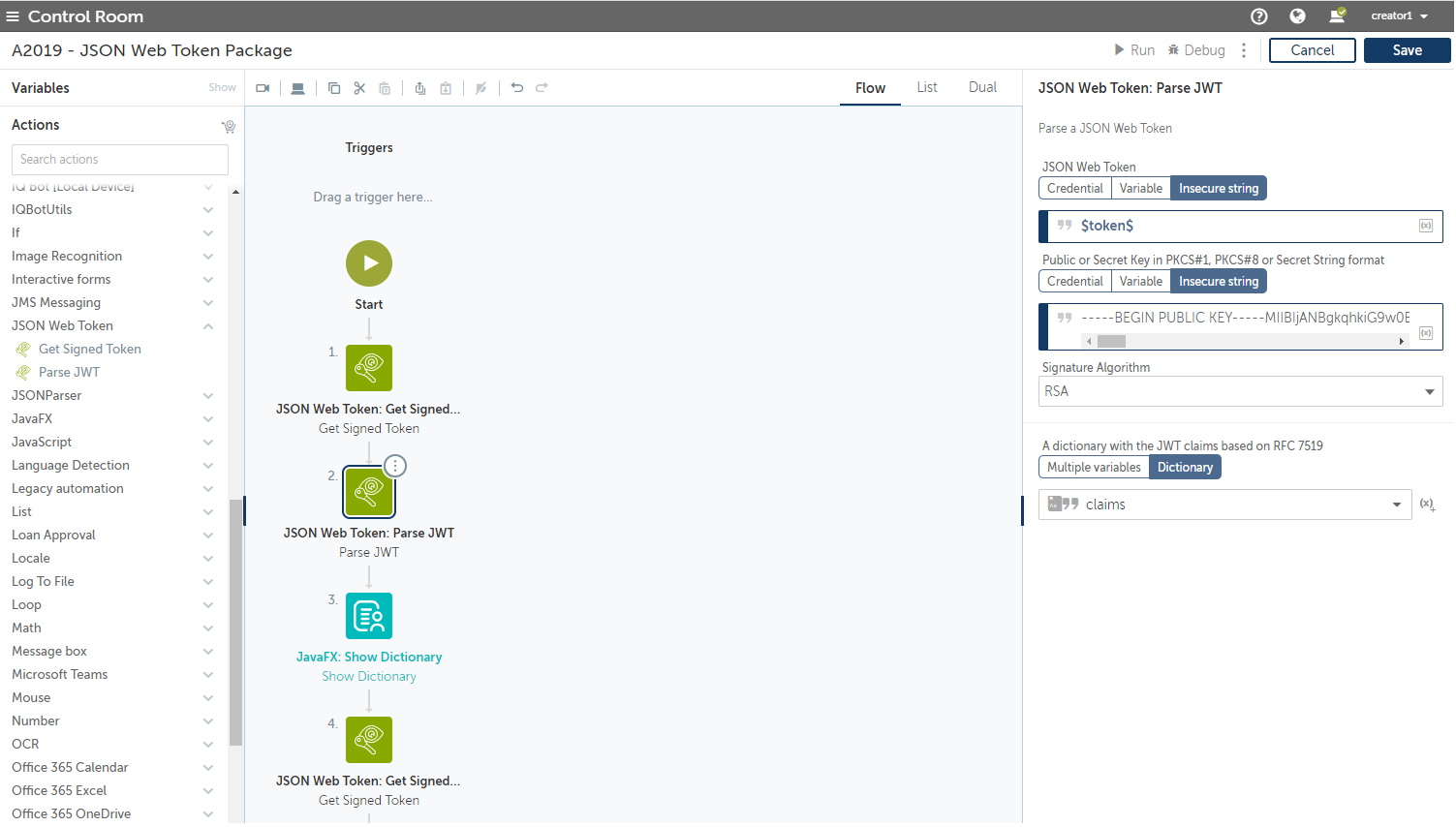 More often modern REST APIs use JSON Web Token to authorize or authenticate a client. With this package, you can generate and validate JSON Web Tokens based on RFC 7519. Custom claims are supported but not custom headers. The Parse action will throw exceptions if the token is not valid or expired.
