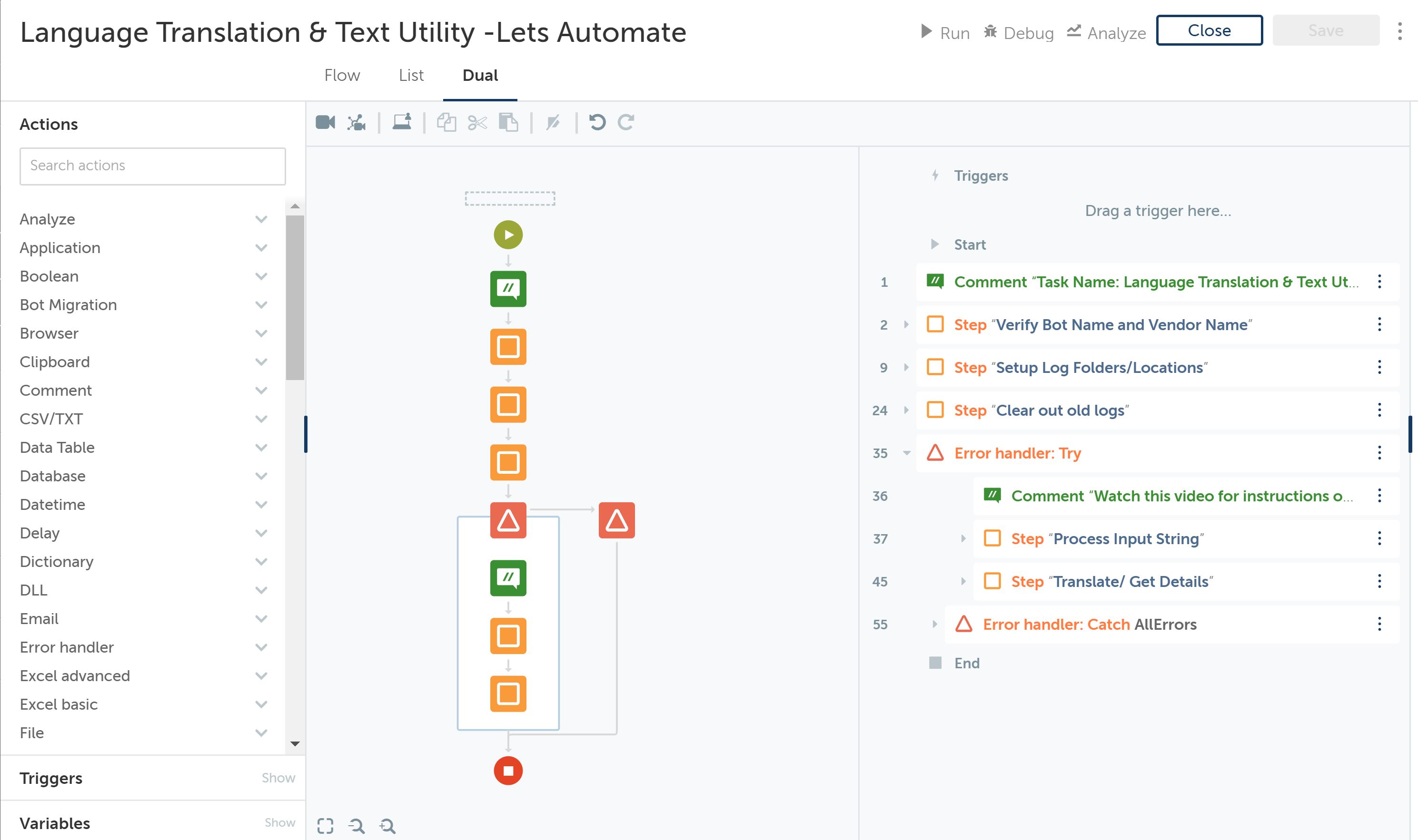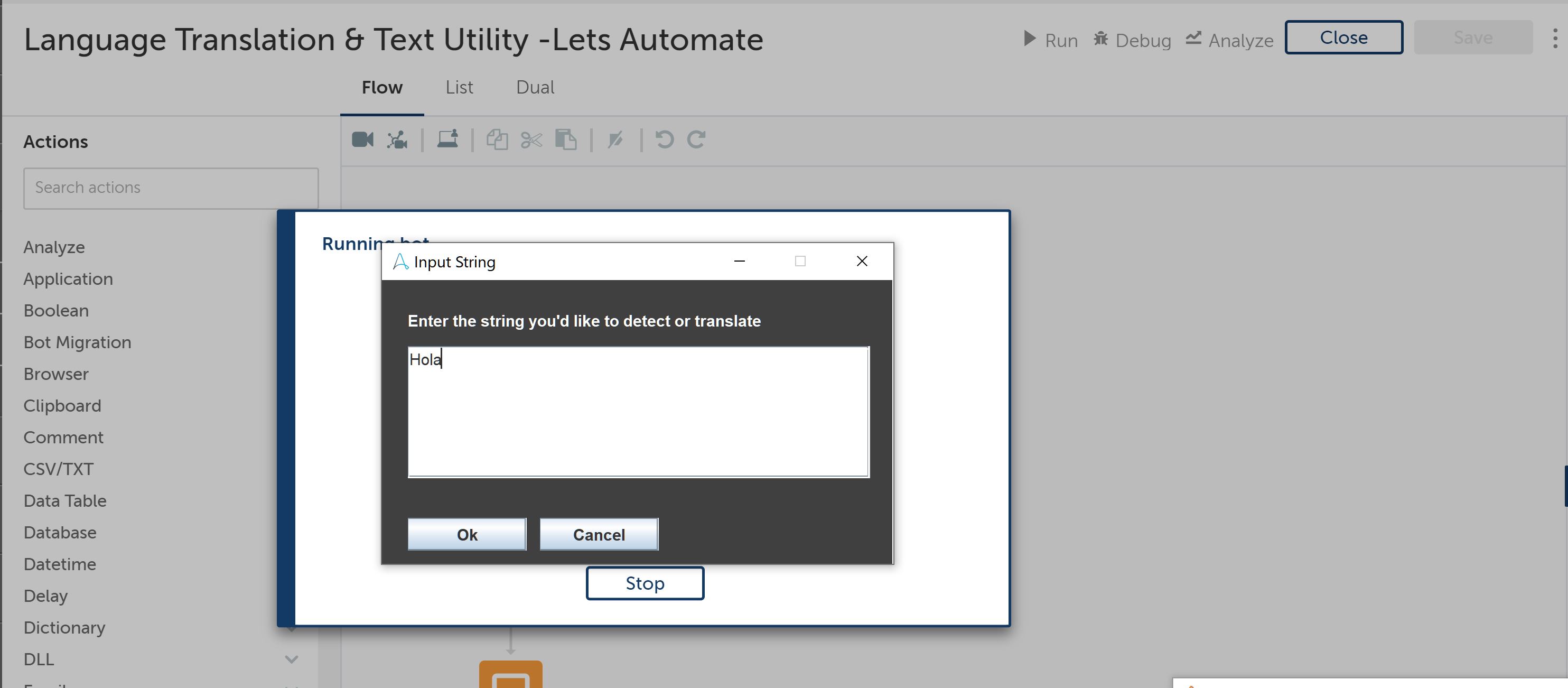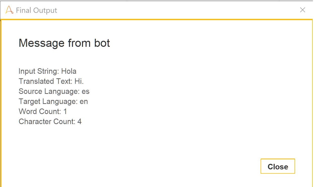 This bot uses IBM Watson translator API integration with Automation Anywhere to detect text in up to 70 different languages and translate input text into any of the supported languages