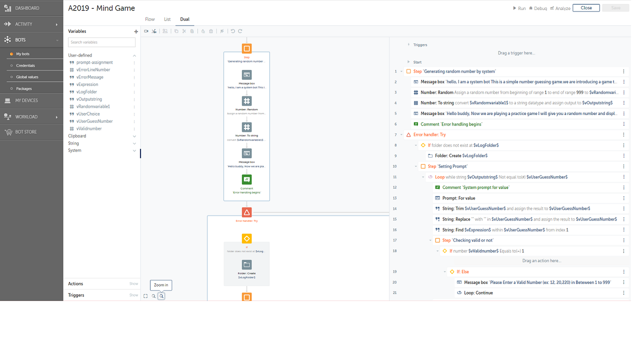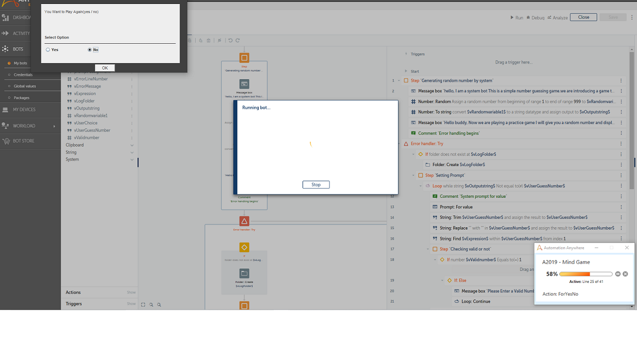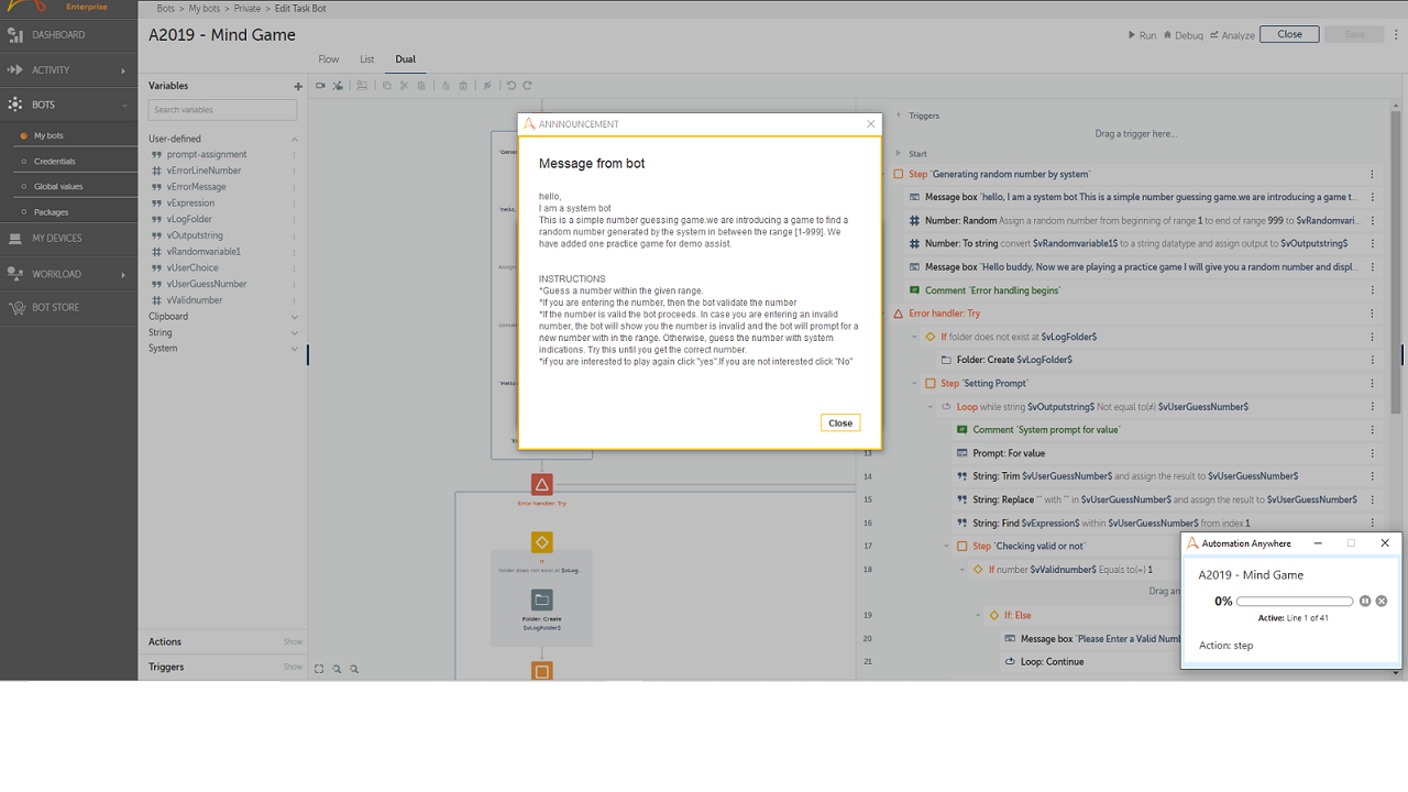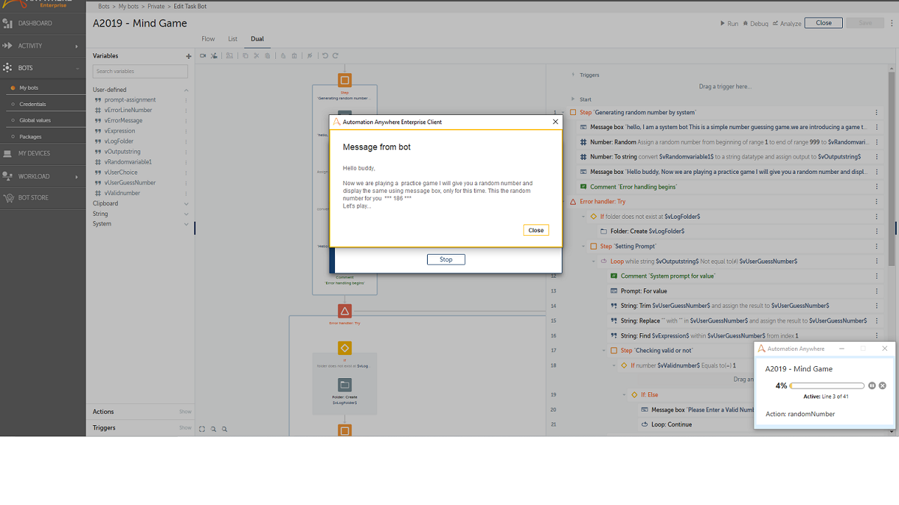 NOTE: You will be given one practice chance to understand the functionality of the bot, initially the generated random number will be displayed in a message box and in the next chance you will have to guess and find out the generated random number.