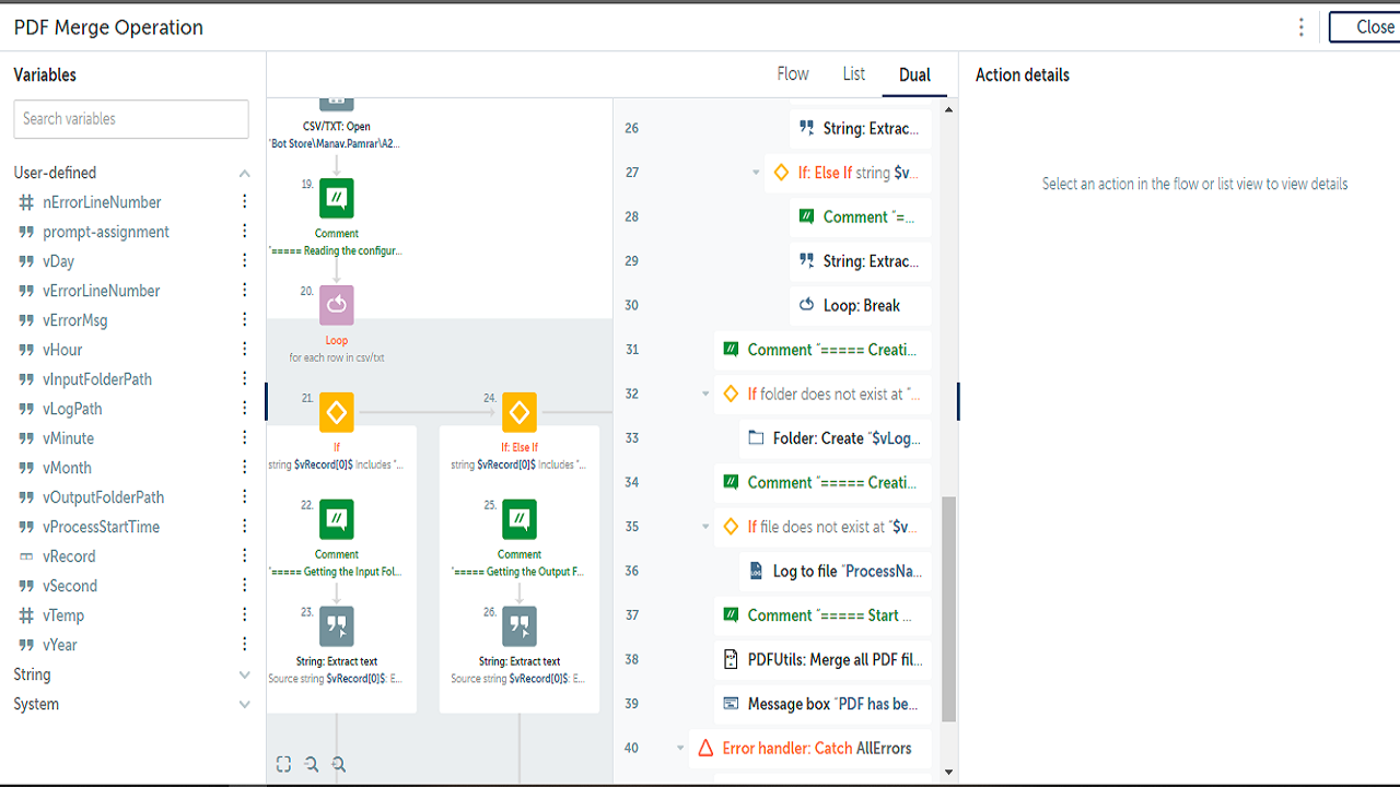 This bot will take an input from the user via a configuration file and read the PDF documents. After, the bot will read the merge instruction from the configuration file which has been passed by the user, then the bot will merge the document.