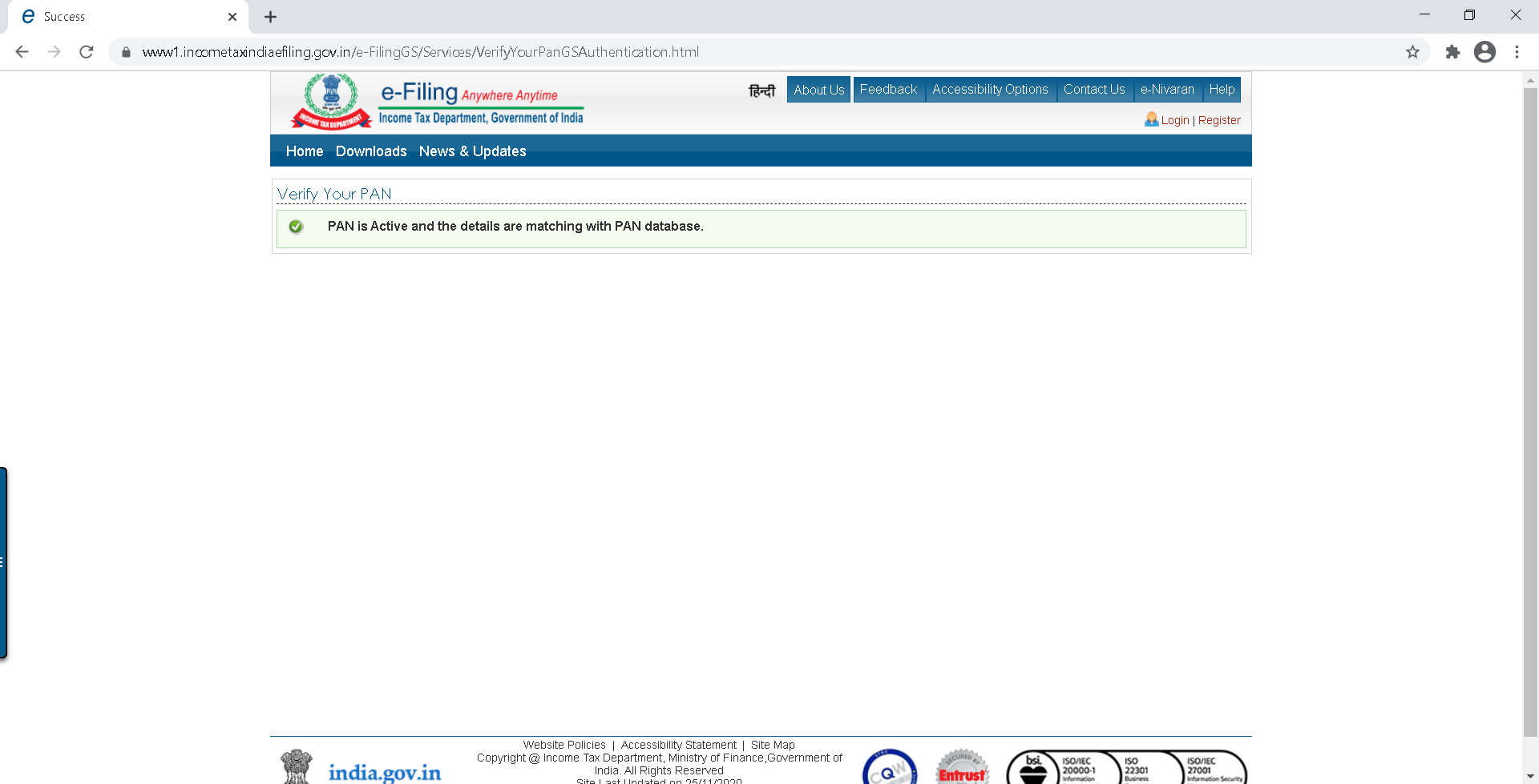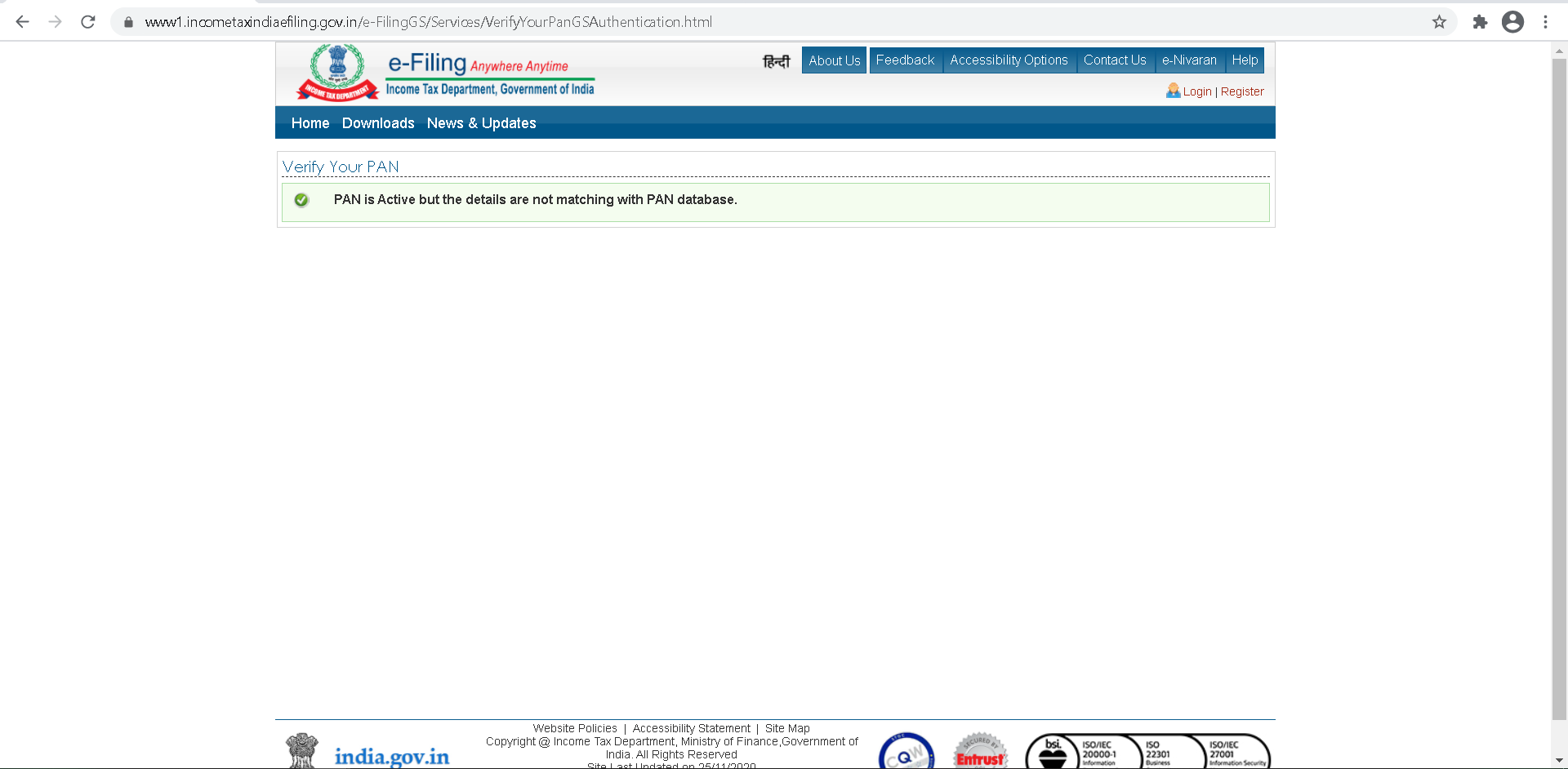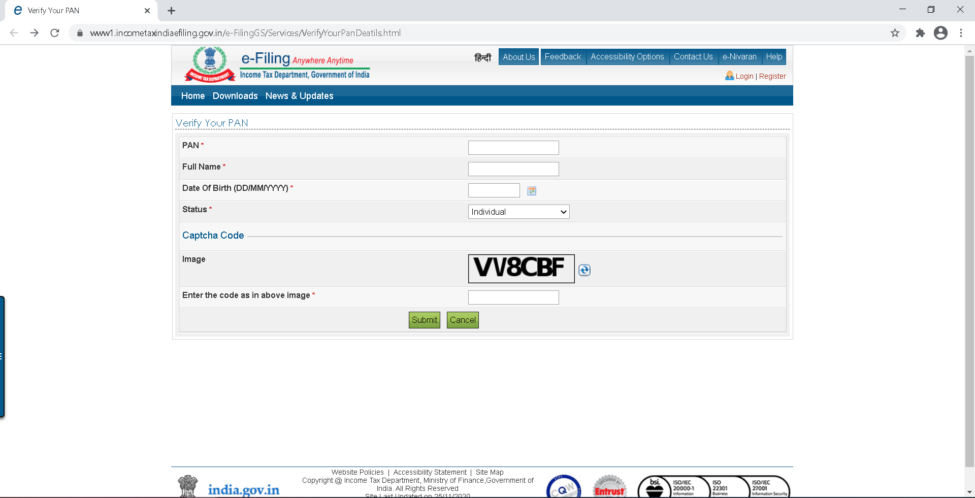 - URL - https://www1.incometaxindiaefiling.gov.in/e-FilingGS/Services/VerifyYourPanDeatils.html must up and running