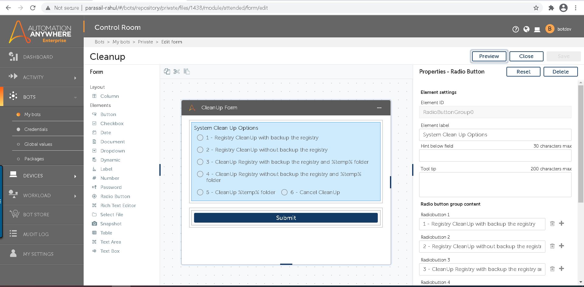 The bot will clear temp files in the temp folder and also clean the registry using Ccleaner software