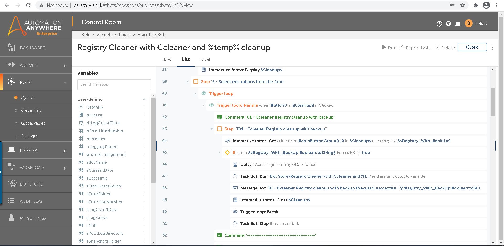 The bot will Clear temp files in %temp% folder and also clean the registry using Ccleaner software.