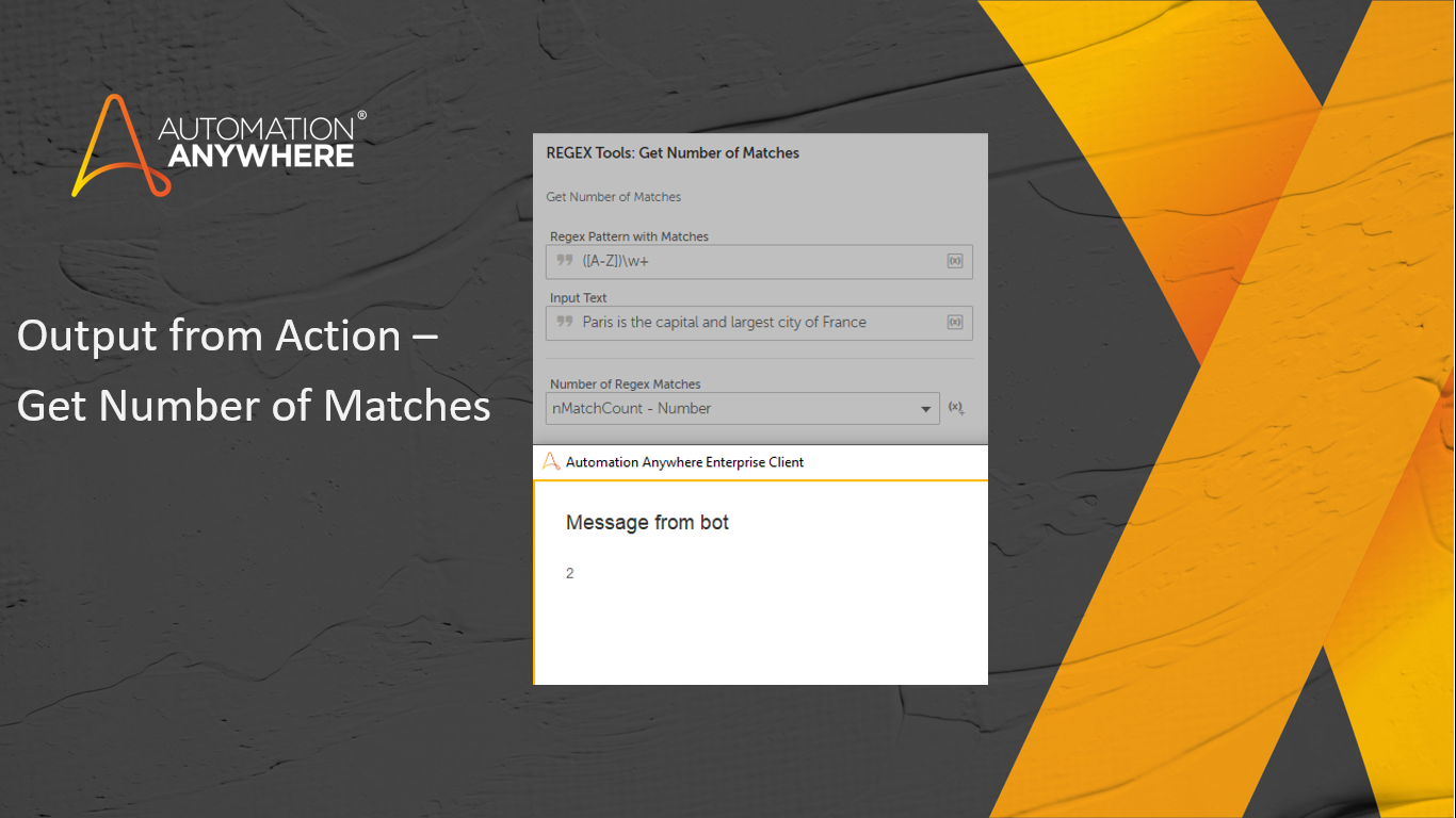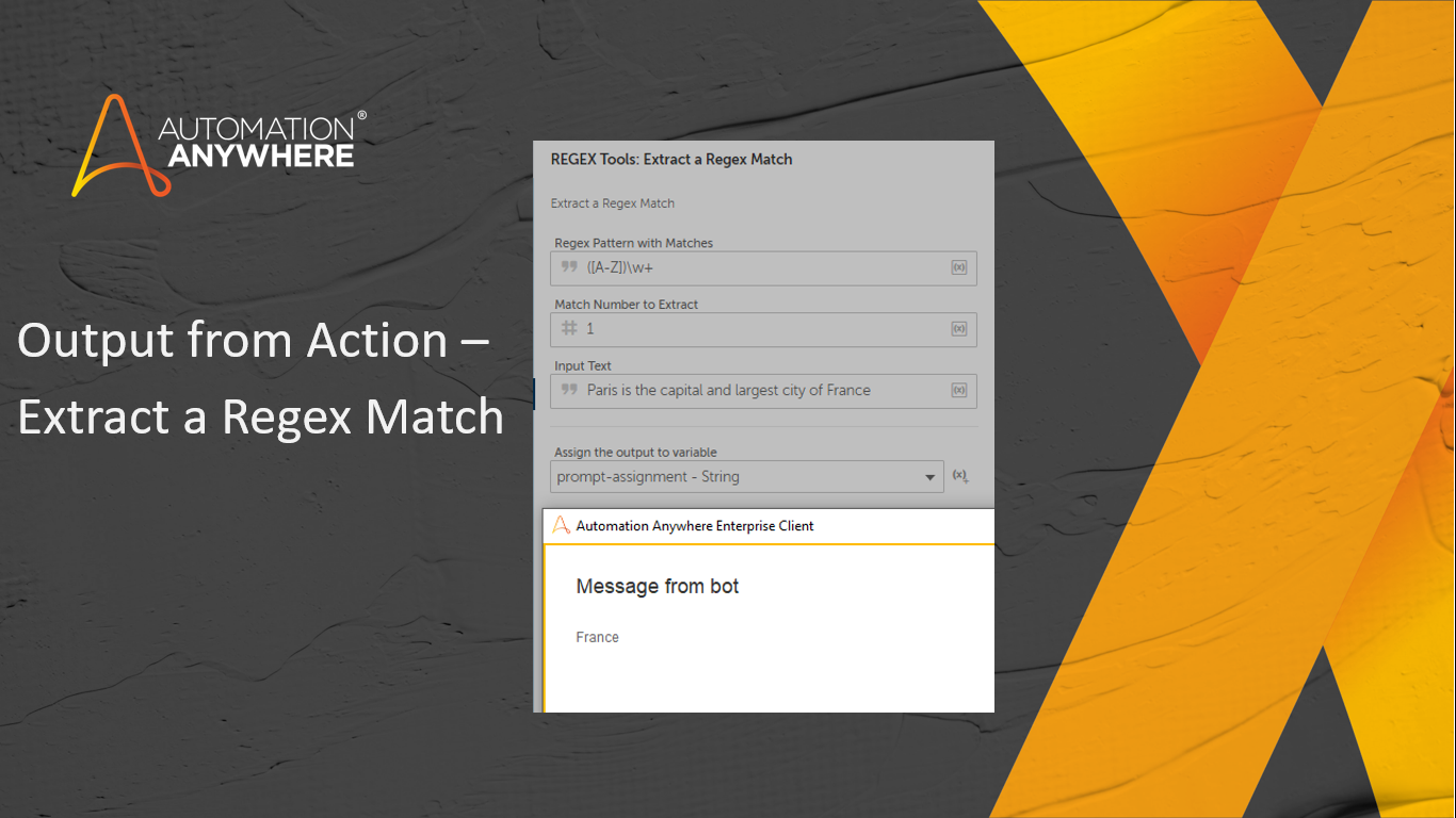 Extract a Regex Match: This action can be used to extract nth match for a specific pattern where n is the user entered number corresponding to the required data.