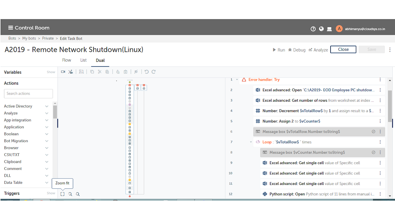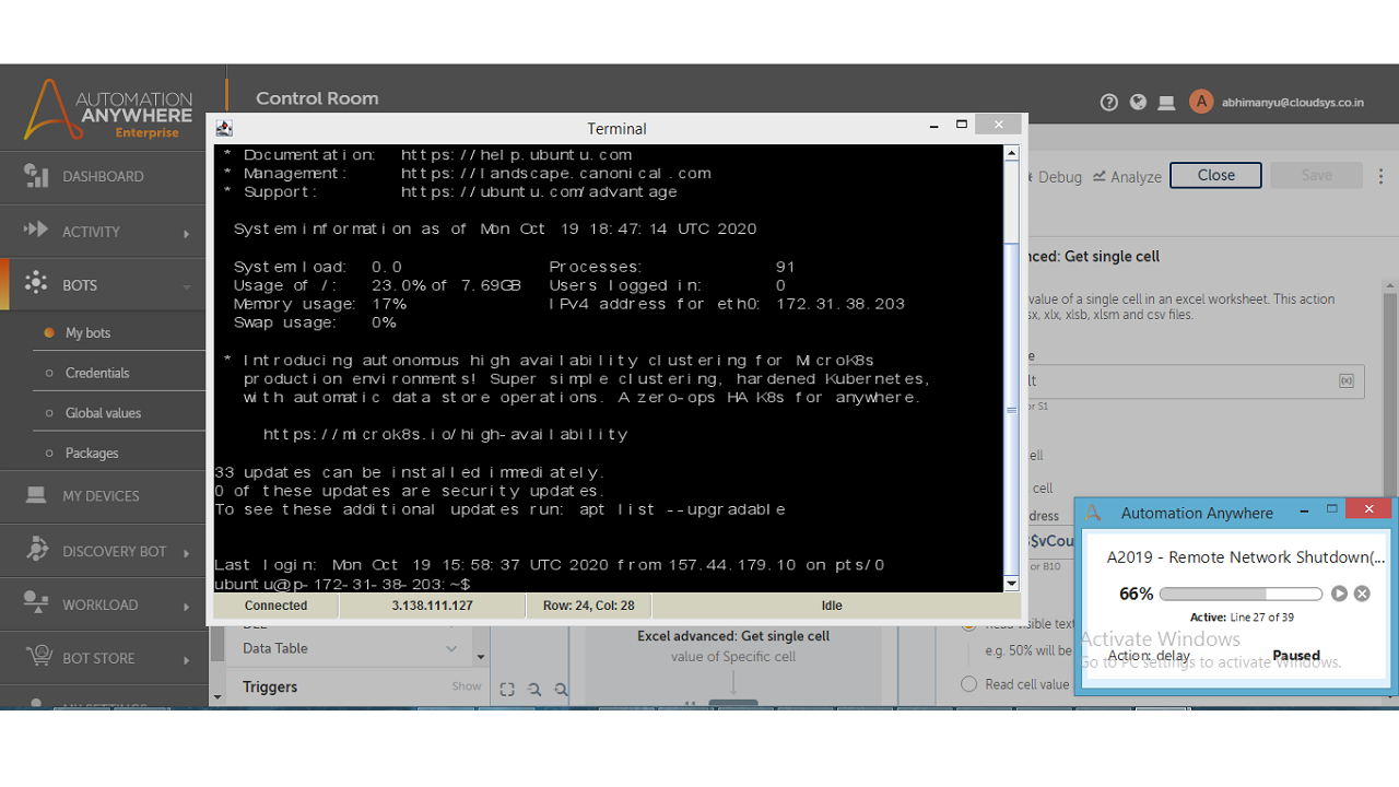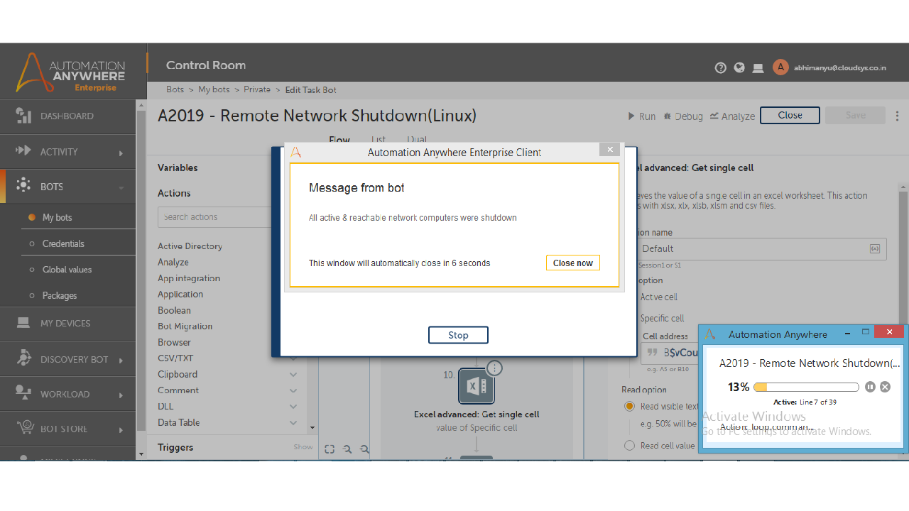This bot will help to shut down a group of employees on Linux machines at end of the day. It will help the organization to save energy without manual intervention. It automatically shuts down the machines which are LAN or WAN. The Admin needs to add the IP/Hostname which is added to be in the Excel sheet. Machines which shutdown should be accessible and telnet service must be activated with port 23 open from bot control room machines