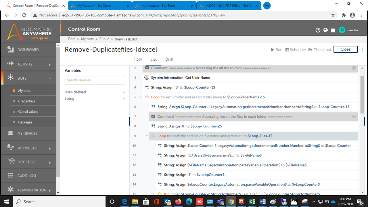 Removing duplicate files from folders is very common. This bot helps the user remove duplicate files from multiple folders based on the file size and content. The input file can be any type (Excel, PDF, TXT, CSV etc.). With the help of the bot, users are able to remove the duplicates files in a faster time period.