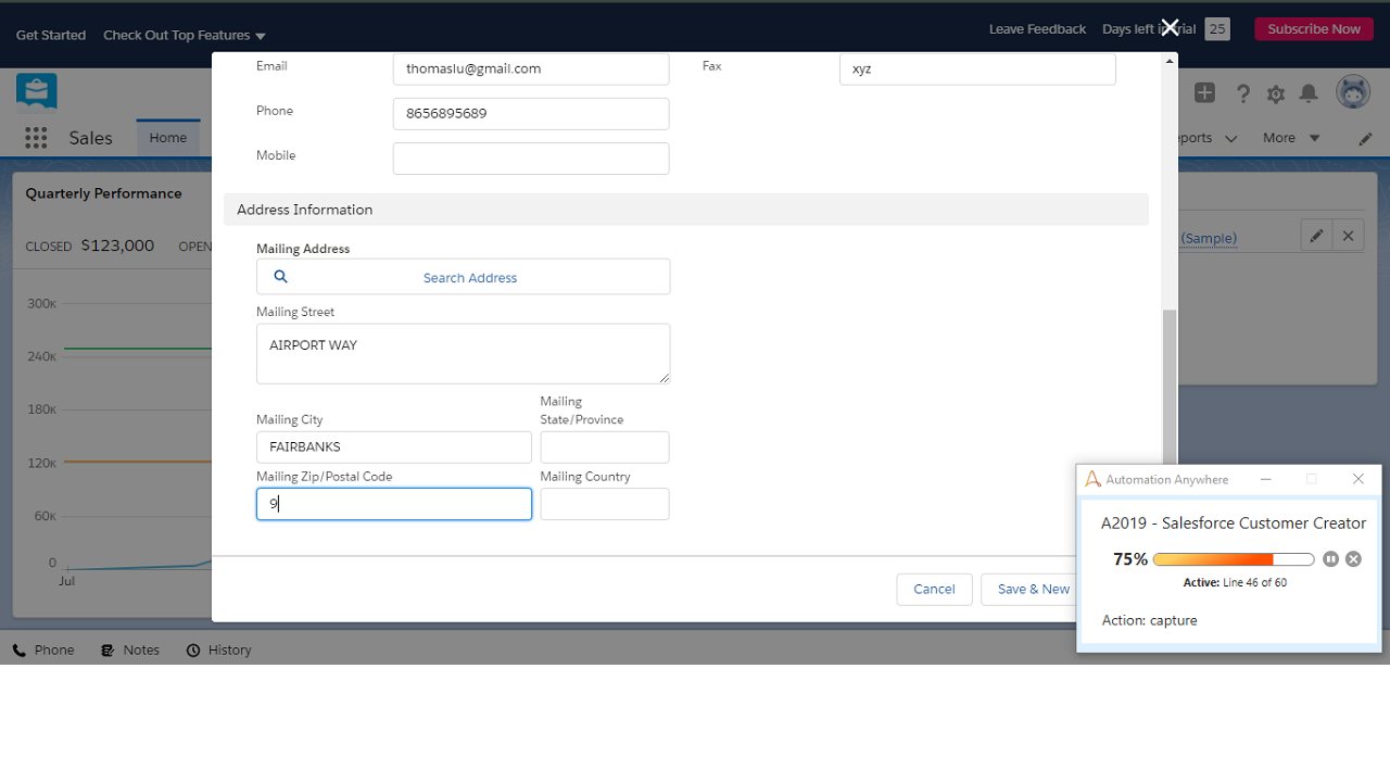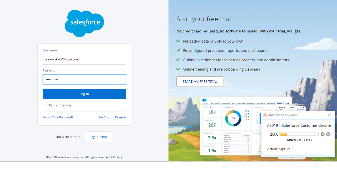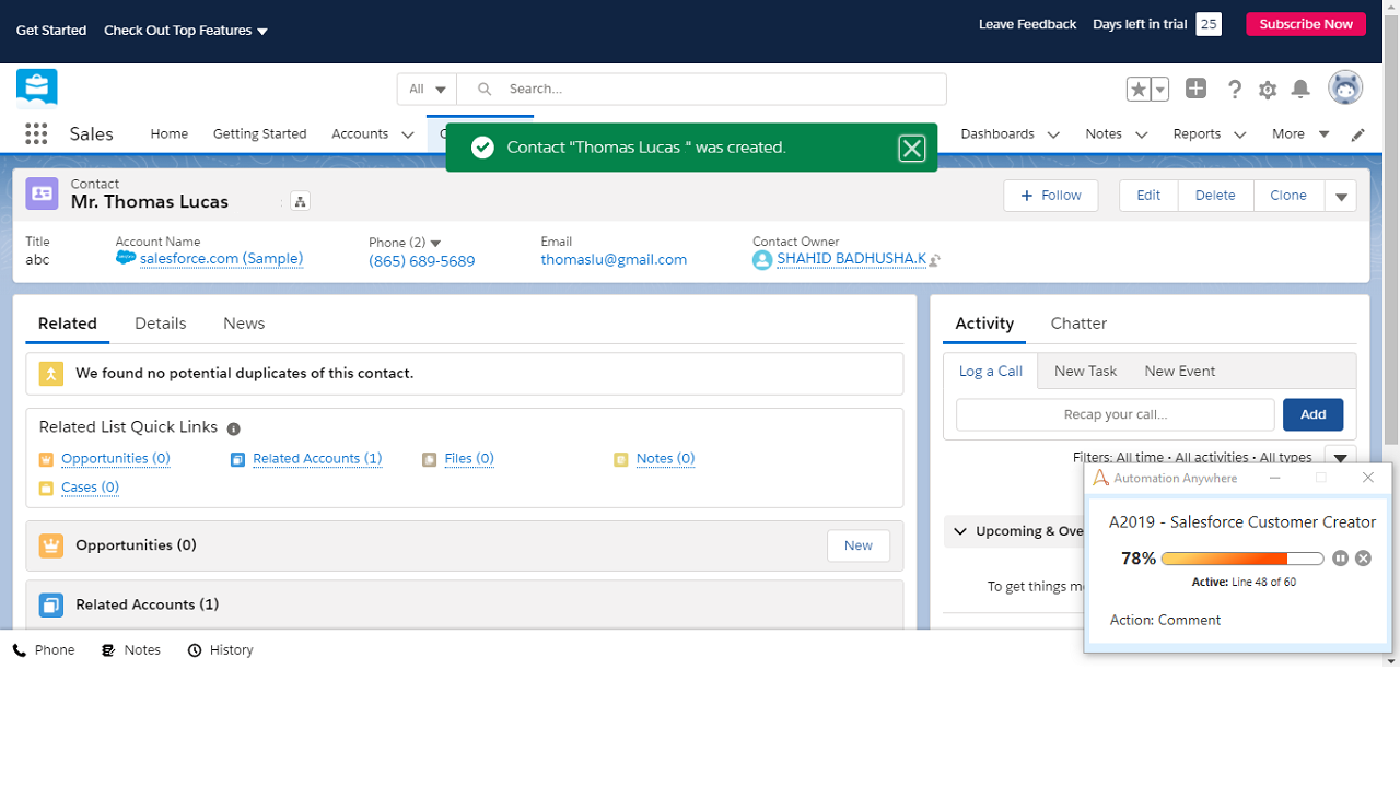The bot logins to the Salesforce account of the user with the username and password provided in input Excel sheet. Then clicks on create new contact and writes the data of new contacts from the Excel sheet to Salesforce. The bot iterates through the input Excel sheet and populates contact details one by one. Likewise, multiple contacts are created in Salesforce. The bot can be scheduled to run at any time. The bot frees the user from the tedious repetitive task of creating customer contact in Salesforce.