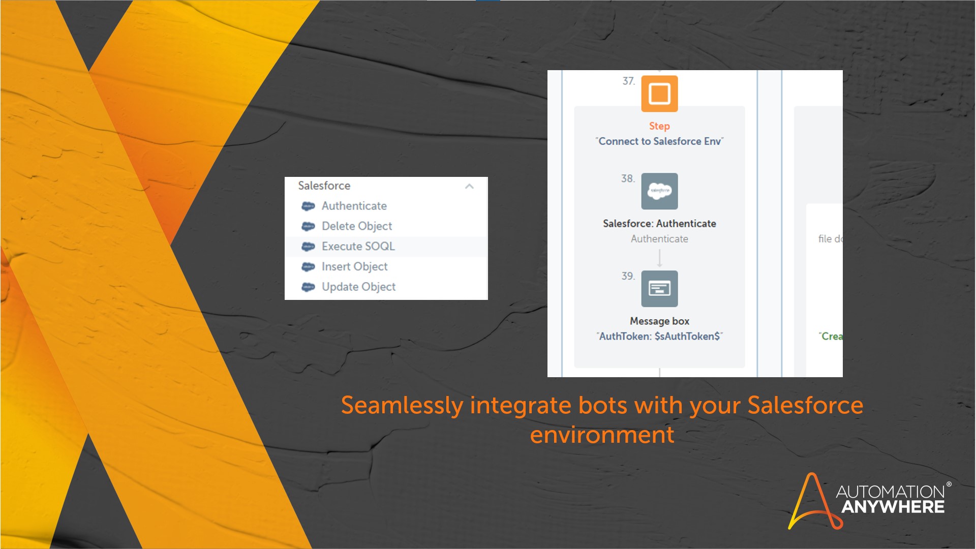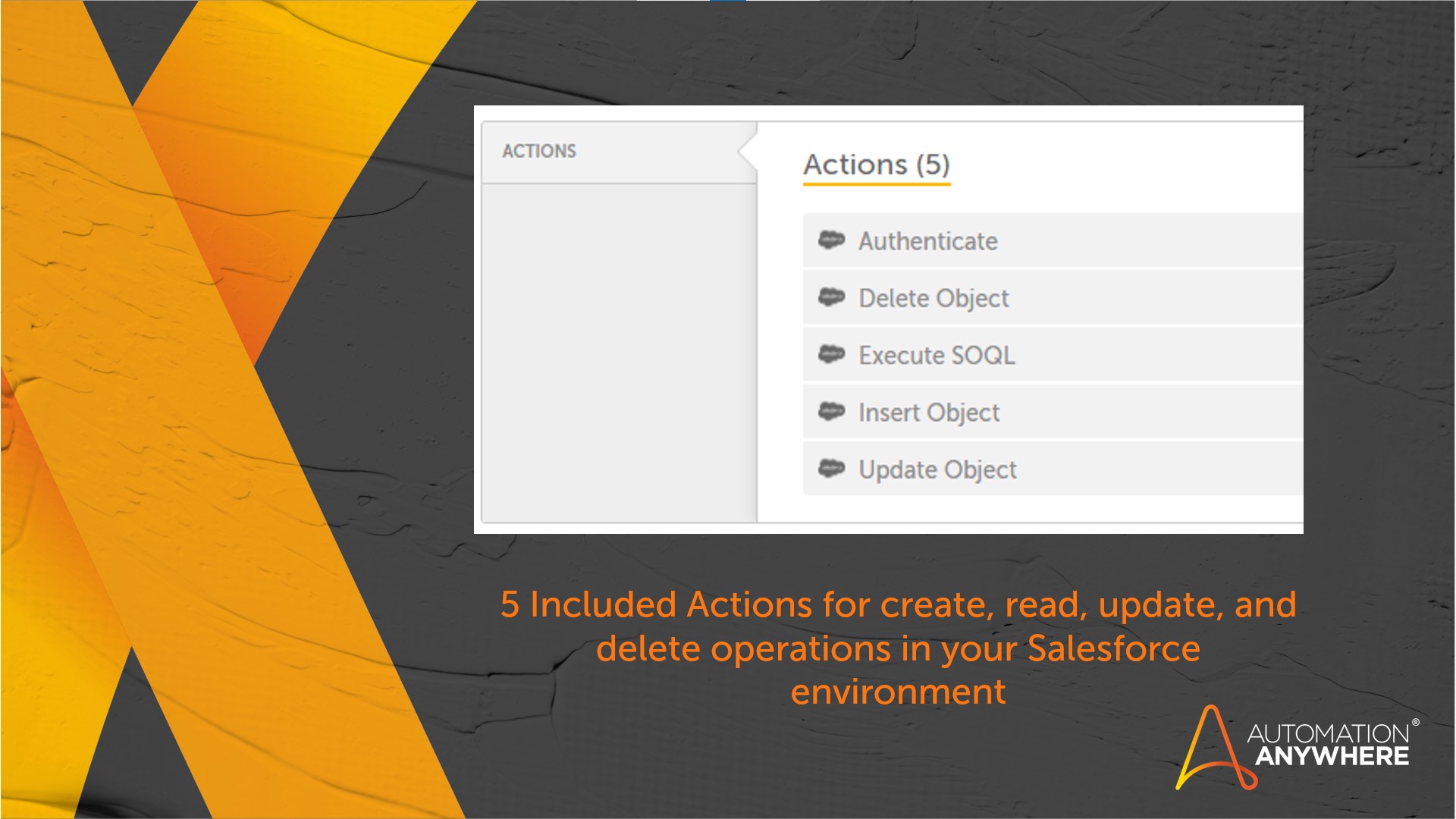 With the Salesforce Package, bot builders can easily take on Salesforce automation initiatives in Automation 360. Across 5 package actions, the Salesforce Package enables developers to quickly and easily query for, update, insert and delete Salesforce Objects. Best of all, these operations can be done on both standard and custom Salesforce object types and attributes. With the capabilities offered in this package, RPA bot builders don't have to worry about the complexities in automating on top of the Salesforce lightning user interface, as their connection to Salesforce is done directly through the Salesforce API (through the use of this package).