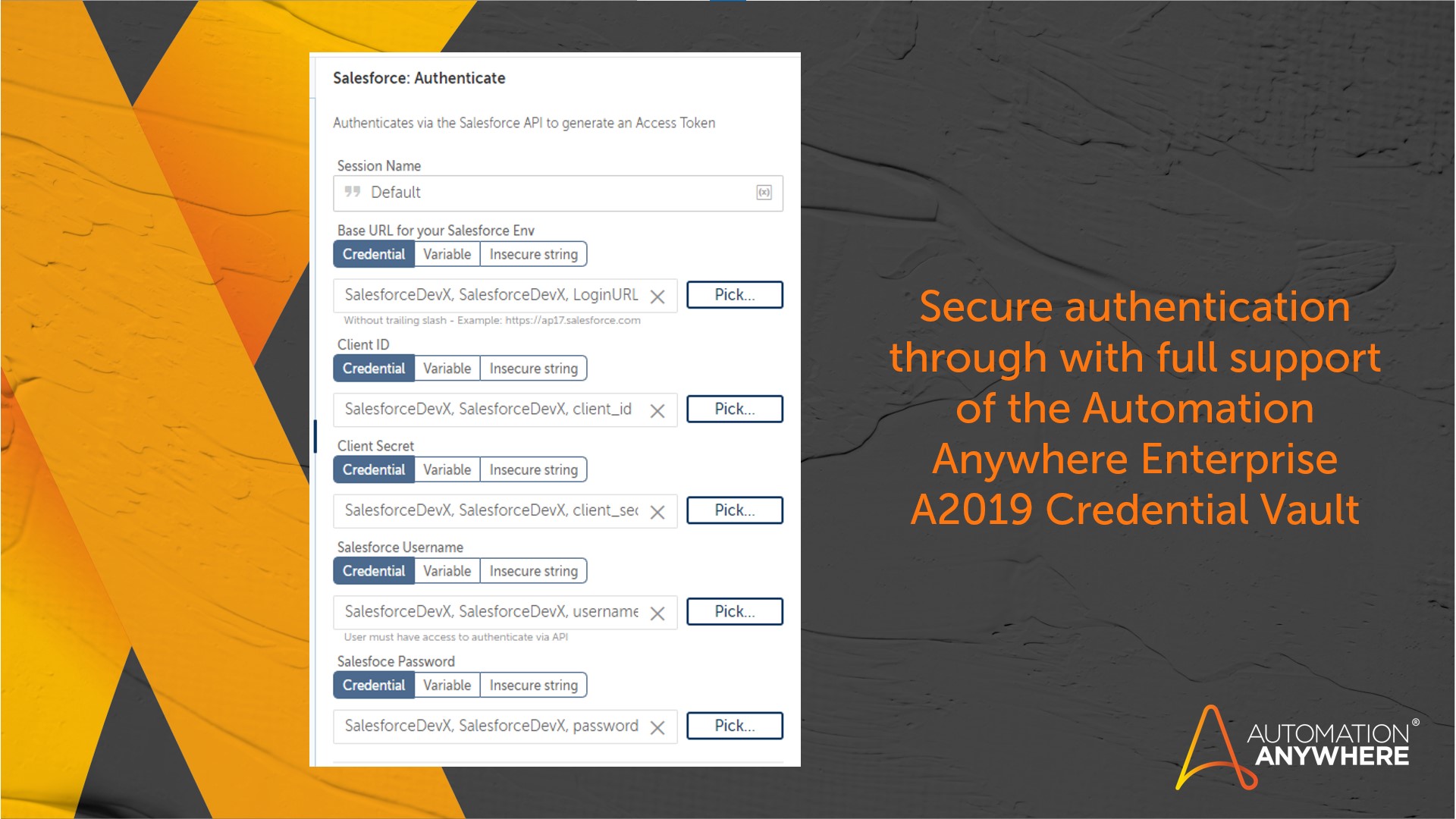 - Authenticate securely to Salesforce using values stored in your Credential Vault