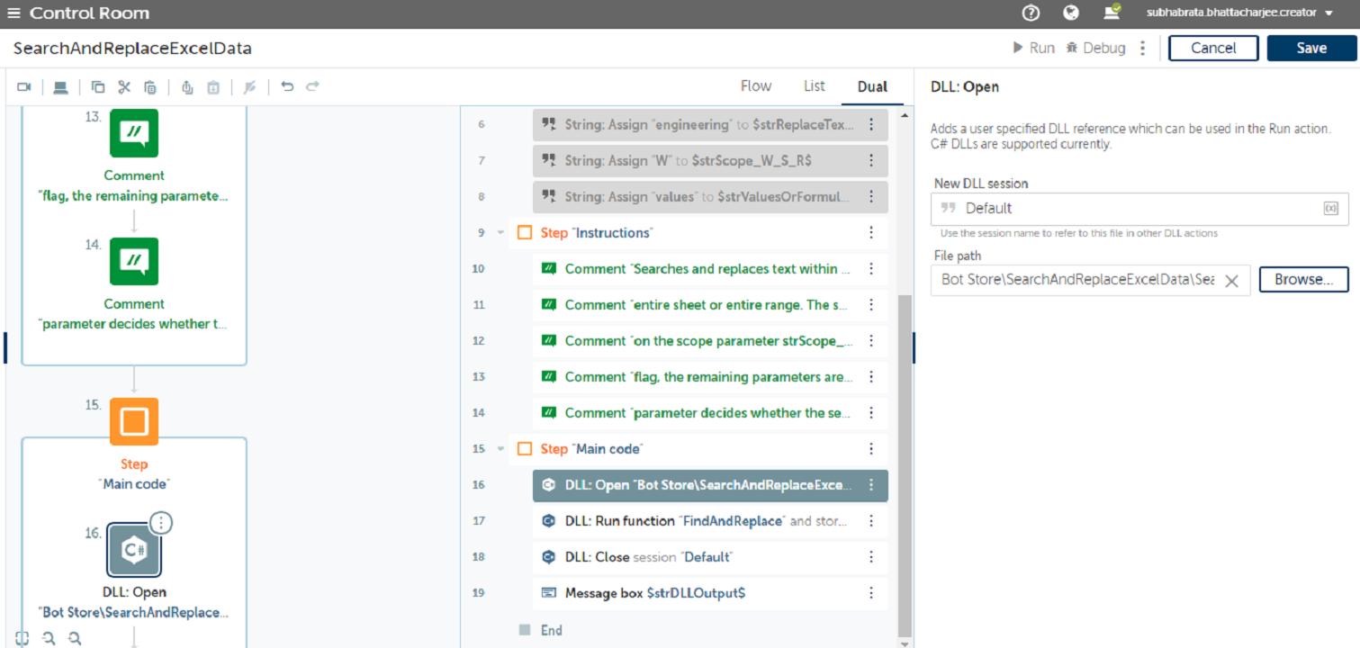 This utility can be used to search a data string in Excel and replace it with a new string. The utility is an Automation 360 bot wrapper around a .Net DLL component. The parameters can be set to define the scope of the search and replace. It can be used on an entire workbook, sheet, or range. Also, we can search by value or formula.