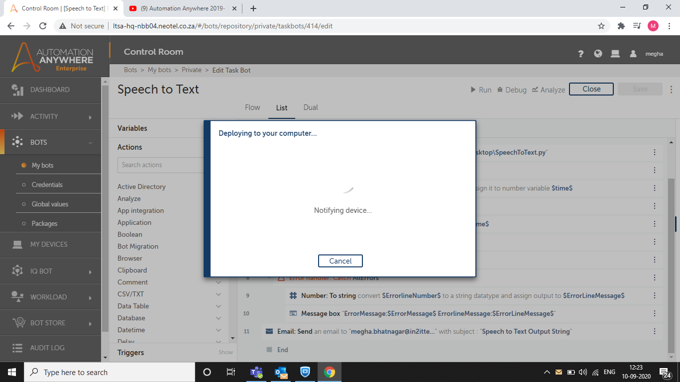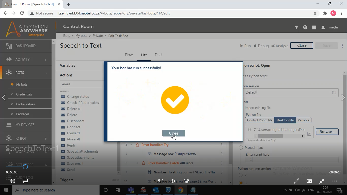 Use the Speech to Text bot to convert any speech to text by using Python script and send this text over mail.