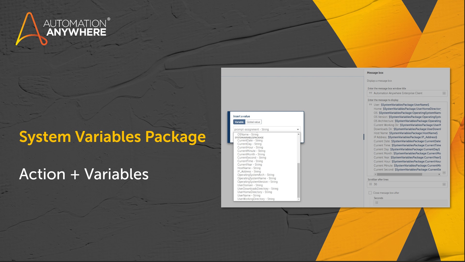 Additional system variables available directly from the insert variables explorer or from a package action.