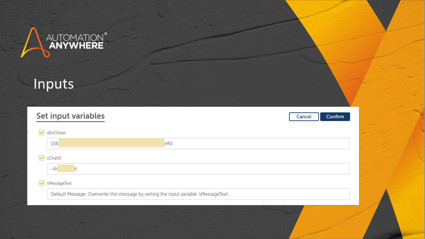 Inputs: Enter the Chat Id, Group Id, or Channel Name