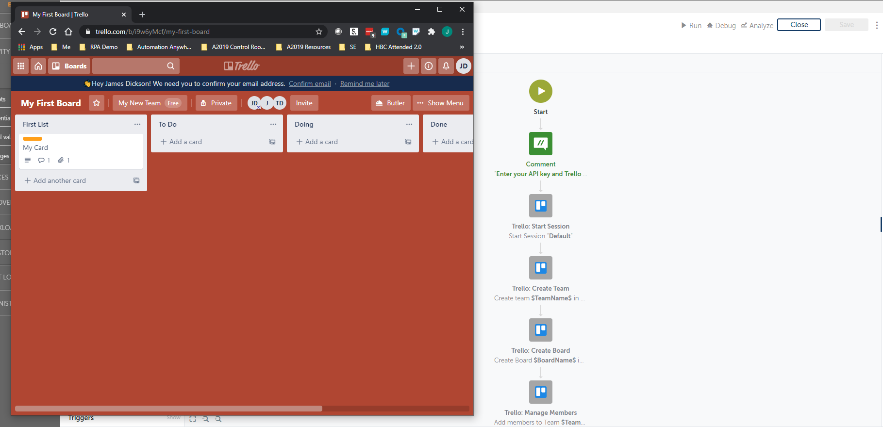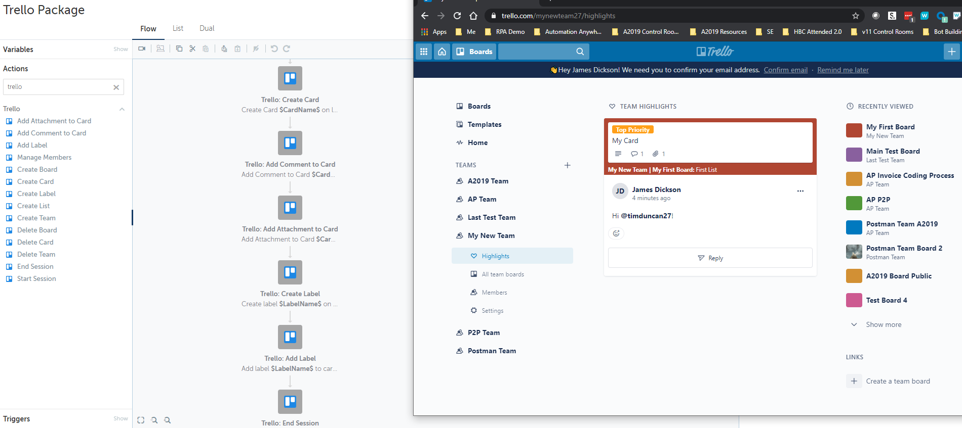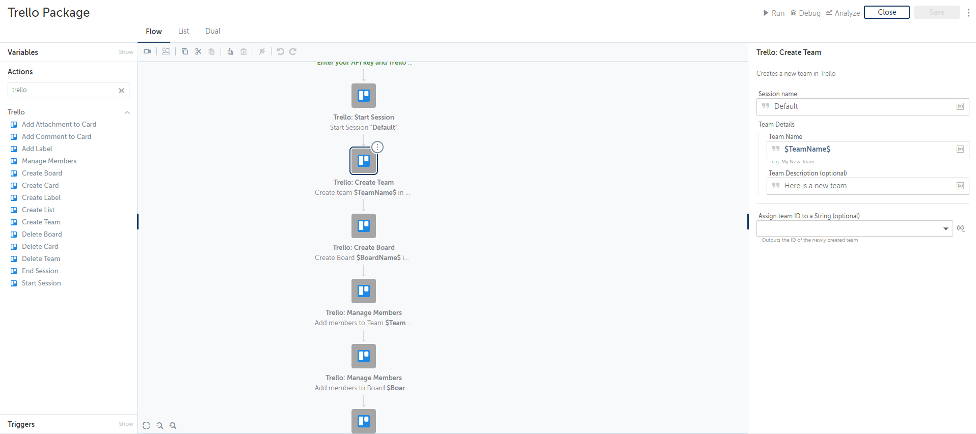 Trello is a productivity and collaboration tool that empowers teams to track activity, manage projects, and ensure accountability. The Trello package enables you to create a bot in minutes to automate the creation of your new team, add a board to that team, and completely define the project milestones along with inviting members to participate. Alternatively, with a single action, your triggered bot can provide real-time card creation, or comments/updates to existing boards to notify team members of new activity.